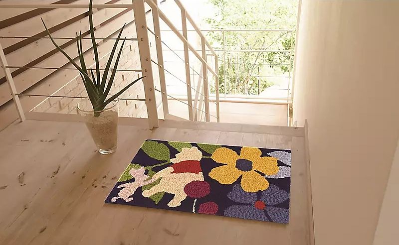 維尼和好朋友小豬牽著手在森林裡漫步的背影,設計在澎澎的地毯上,以大色塊的幾何圖形呈現,看起來現代時尚有充滿童趣。放在家中不但可愛,也很有設計感!