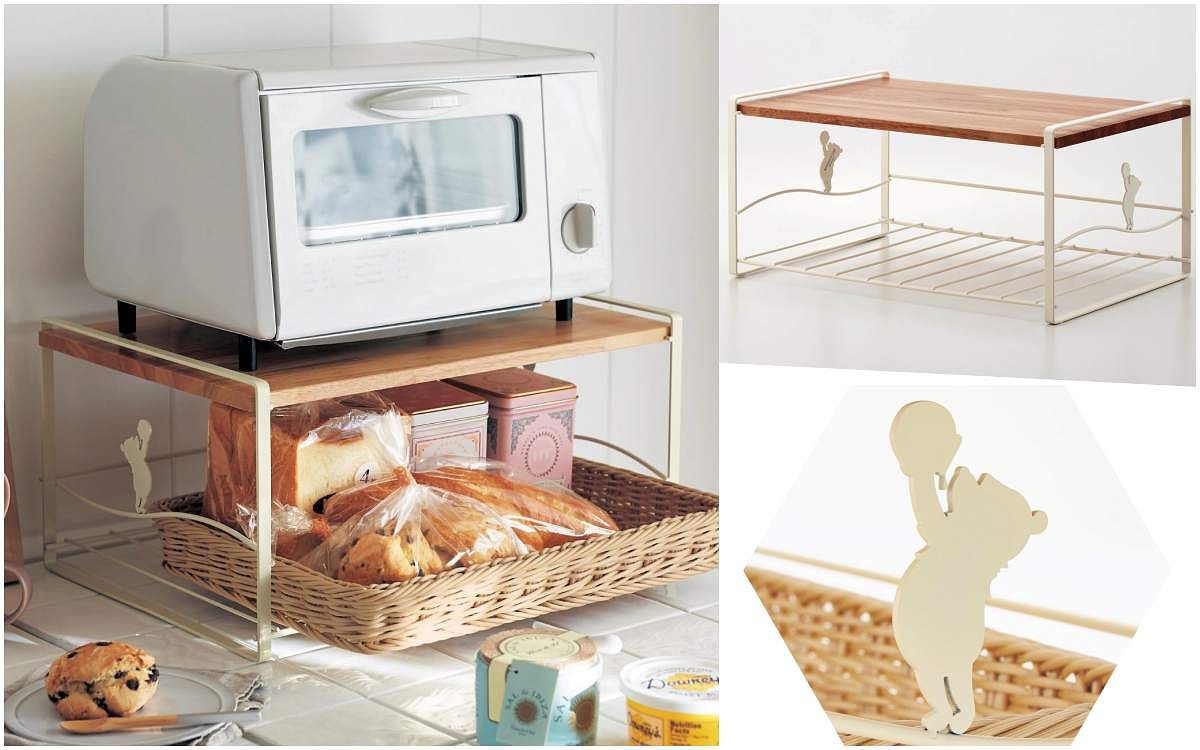 適合放在廚房中置放小烤箱、吐司機、咖啡機等廚房小家電的雙層收納架,以木製隔板與防水小竹籃來分隔空間與食材收納,機能性十足。然而這款收納單品最具巧思的莫過於側邊的小熊維尼喝蜂蜜的剪影,真的是太可愛了!