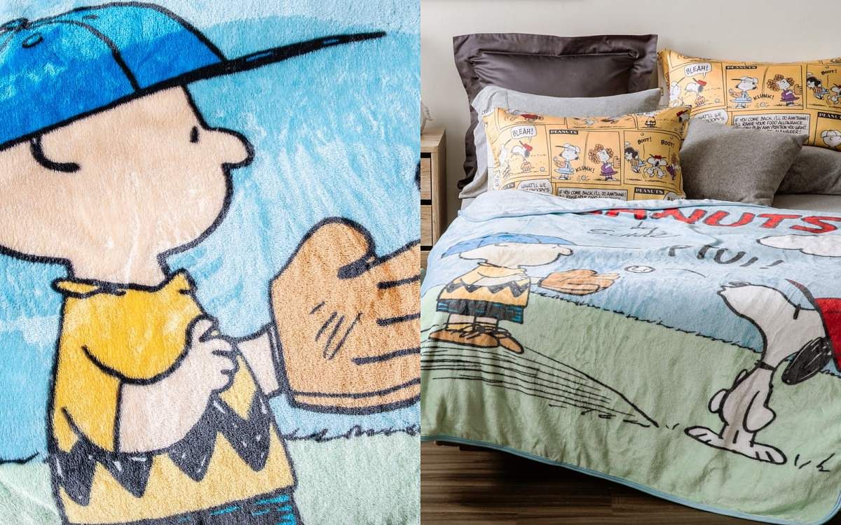 查理布朗與史努比一起練習棒球的單面印花圖案,滿版設計色彩鮮明,一放在房間就很有重點。材質同樣輕柔舒適,又具有極佳保暖度,同時透氣性強能助於排汗排濕氣。雙面刷毛及磨毛布滾邊設計法蘭絨毯,能輕鬆收納於組合中的帆布束口收納袋中。
