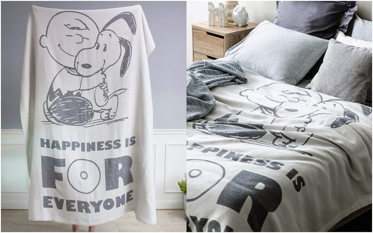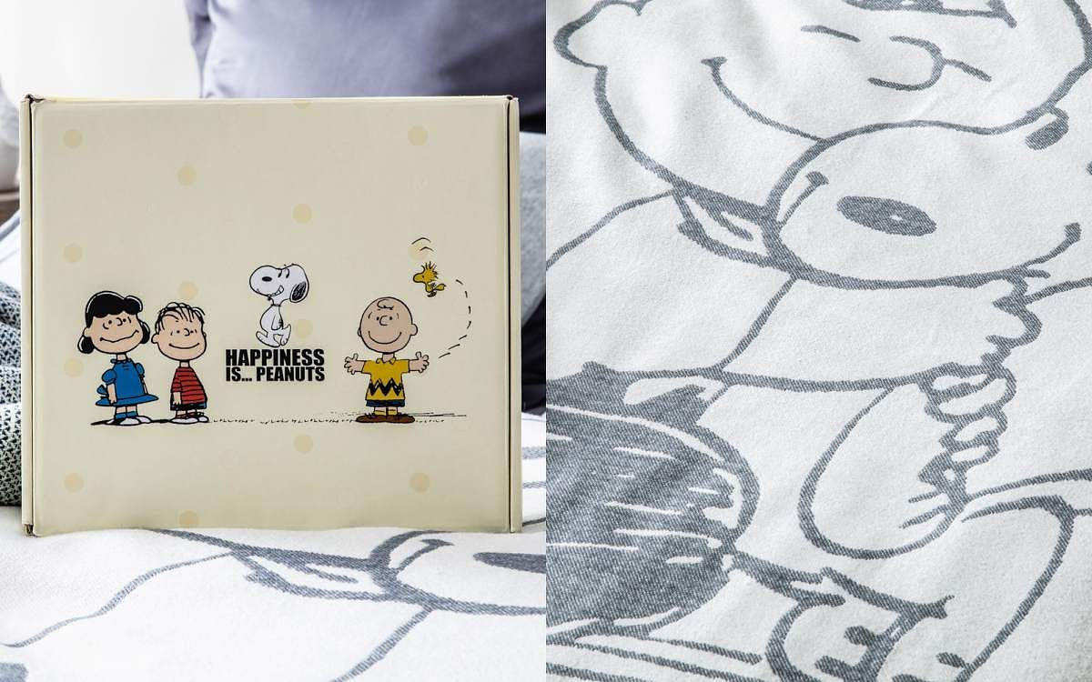 獨版梭織緹花布,不但輕柔舒適,保暖性也佳,單面雙層正反織法,圖案正反面互為相反配色。寬大的150x180公分,適合在臥房、客廳、書房或舖或蓋,禮盒的包裝設計也很適合當作入厝禮物!淺灰與白色的簡約配色,更加突顯了史努比的漫畫風格。