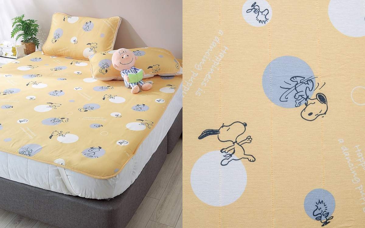 涼感面料摸起來舒適柔軟,夏天躺起來吸濕又乾爽。磨毛布滾邊設計搭配背面鬆緊帶設計,固定方便又能保持床墊的潔淨,各種動作的史努比萌度爆表!