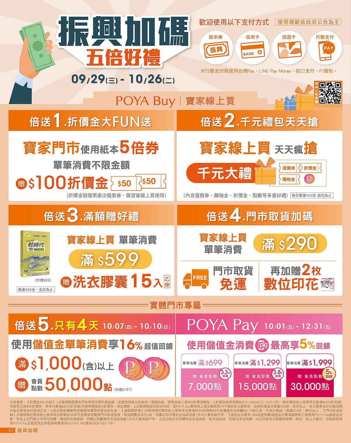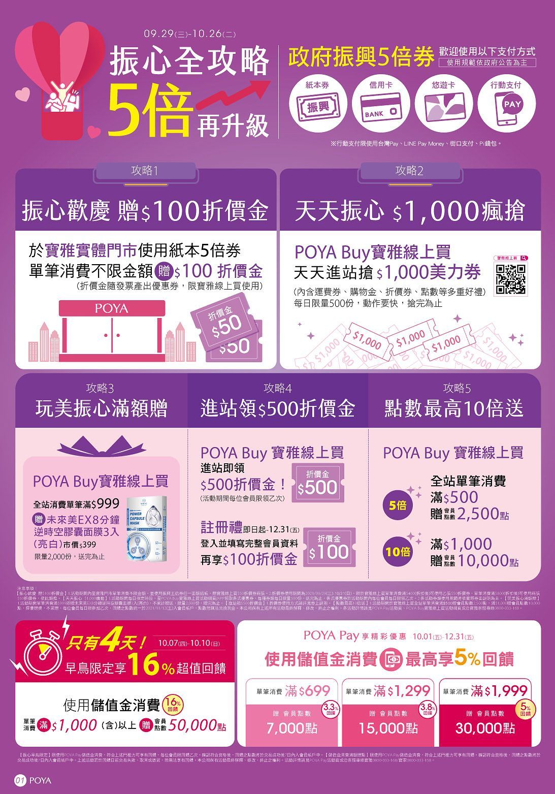 憑紙本五倍劵消費不限金額就贈百元折價金,將全數紙本五倍劵至寶雅消費,最高可換到價值6000的消費額度,放大五倍券超有感!還有限定4天早鳥振興方案,10/7-10/10凡在全台寶雅寶家實體門市使用儲值金消費消費滿1,000元就贈會員點數50,000點,相當於16%超值好康回饋!即日起至10/12,POYA寶雅搶先振心大方送,POYA Buy寶雅線上買單筆滿$290元享到店取貨免運,超值送$100元門市折價金及抽取衛生紙6入一袋,另外搭配點數振心活動,購買指定商品最高享10%點數回饋,讓購物心情振心5倍再升級,寶雅振心加碼絕對有感。