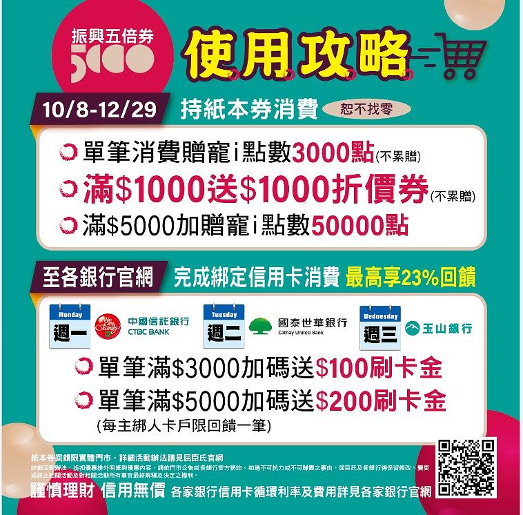 無論使用紙本振興五倍券或綁定指定信用卡消費皆可享有多重優惠