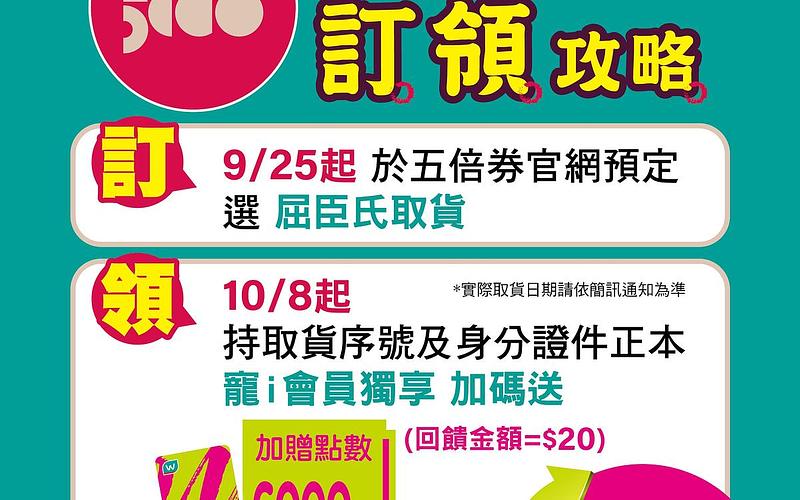 針對五倍券,國民藥妝店「屈臣氏」也宣布推出「振興五倍券放大攻略」,只要於五倍券官網預定,10/8起於屈臣氏門市領取紙本振興五倍券,屈臣氏寵i會員更可於領券時加碼獲得6,000點寵i點數(價值20元)