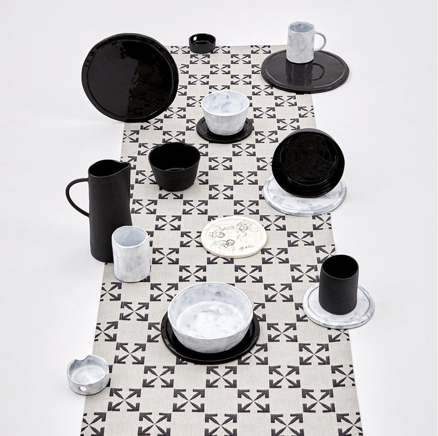 來到廚房,除了餐桌上的裝飾之外,也包括陶瓷碗盤組。餐桌上的陳設有桌布、桌墊、桌旗以及餐巾組,全都飾以滿滿的經典箭頭印花;陶瓷碗盤組有霧面黑及亮面淺灰兩種色調,品項包括:馬克杯、玻璃杯、水壺、碗盤甚至是菸灰缸,也都分別在背面印上Off-White™ 經典logo壓花。