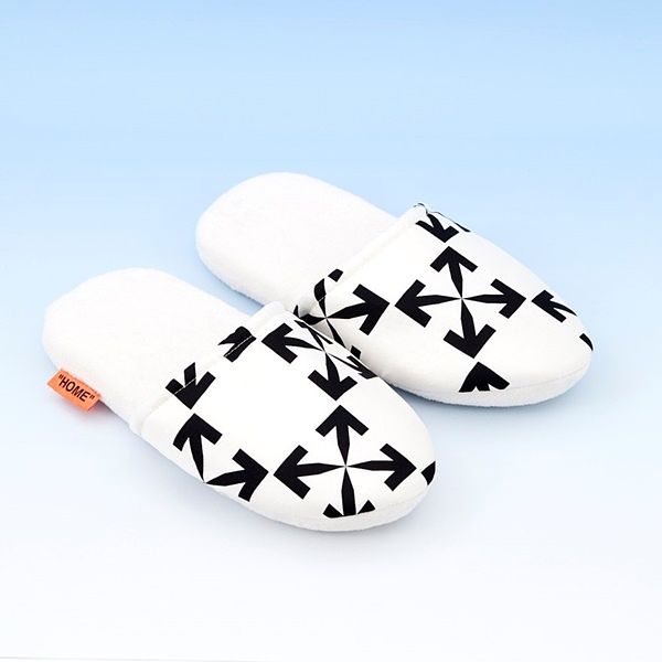 針對臥室裡所設計的寢具擺飾及居家服飾,推出灰色及米色亞麻兩款雙人寢具組,枕套上均繡有花卉的經典箭頭圖案,床單也印上Off-White™徽標,被套底下則帶有流星雨挖洞元素的家居系列亮橘標籤。居家服飾類除了睡衣及睡袍,也包括絲質及毛巾布的室內拖鞋,皆佈滿經典的箭頭圖騰。系列中的浴室商品有:毛巾組合、浴巾組合以及浴袍。灰色及白色款式均繡有”游泳者” logo,而另一箭頭圖騰印花款式,皆縫上代表本系列的亮橘標籤;一系列玳瑁色鏡子、梳子以及牙刷,採大理石紋路並搭配金色logo,每樣商品都賦予了流星雨挖洞設計。
