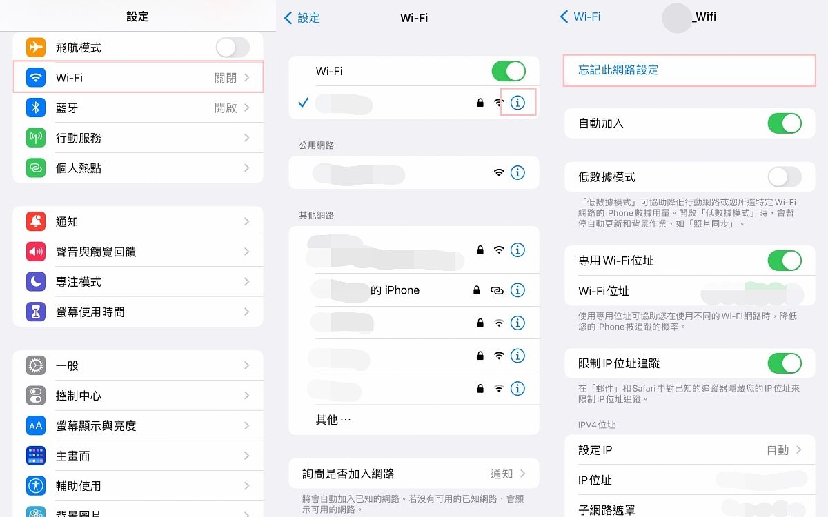 而如果你是使用Wi-Fi網路出現連線不穩或連不上等異常狀況,且重新連線也無法順利解決時,建議可以從「設定」→「Wi-Fi」→找到目前連線Wi-Fi→點擊名稱右側「i」按鈕→選擇「忘記此網路設定」,接著手機就會將此Wi-Fi的紀錄重置,此時就能再次選擇此Wi-Fi並輸入密碼來完成網路設定。