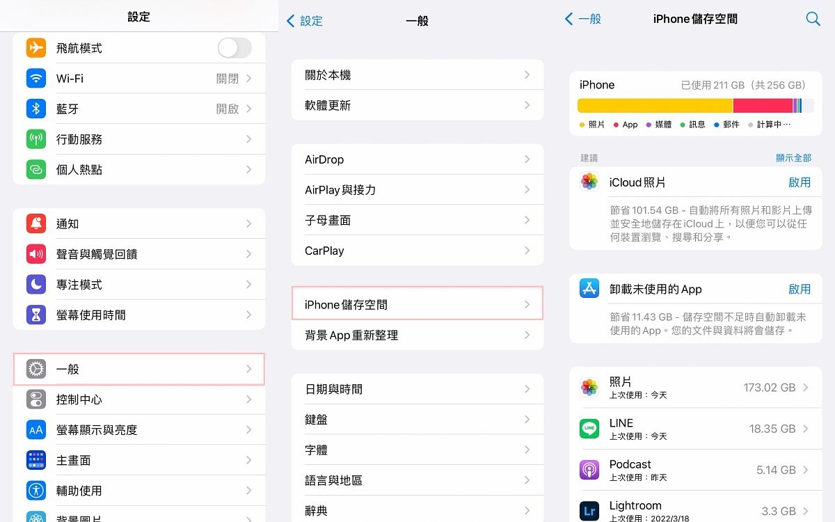當你重開機後還是覺得手機操作很Lag,或APP時常閃退、當掉無法使用,此時建議先去查看iPhone本身剩餘的儲存空間,因內部儲存空間若被APP、照片檔案佔據75%以上,會影響部分手機功能也易耗電。可從「設定」→「一般」→「iPhone儲存空間」去查看目前剩餘容量、佔據較多容量的部份去做刪減,讓手機有足夠空間進行運轉。