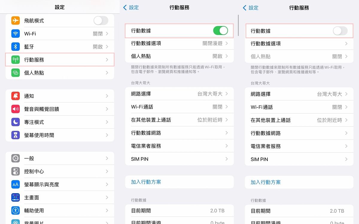 若平常突然發現網路連不上,不全然是手機內部問題,可透過「設定」→「行動服務」→「行動數據」重啟,來讓本身使用的手機行動網路重新連接,解決3G/4G連不上或跑很慢的問題,因為有時其實是我們使用的電信問題。