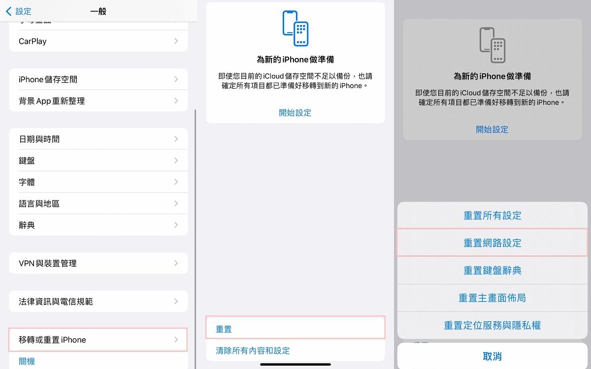 如果上一個方法還是無法解決網路連線問題,建議可透過「設定」→「一般」→「移轉或重置iPhone」→「重置」→「重置網路設定」來恢復成iPhone出廠預設值,大家不用擔心,這個方法並不會刪除iPhone中任何個人資料,而只會刪除目前原有的所有網路設定而已。