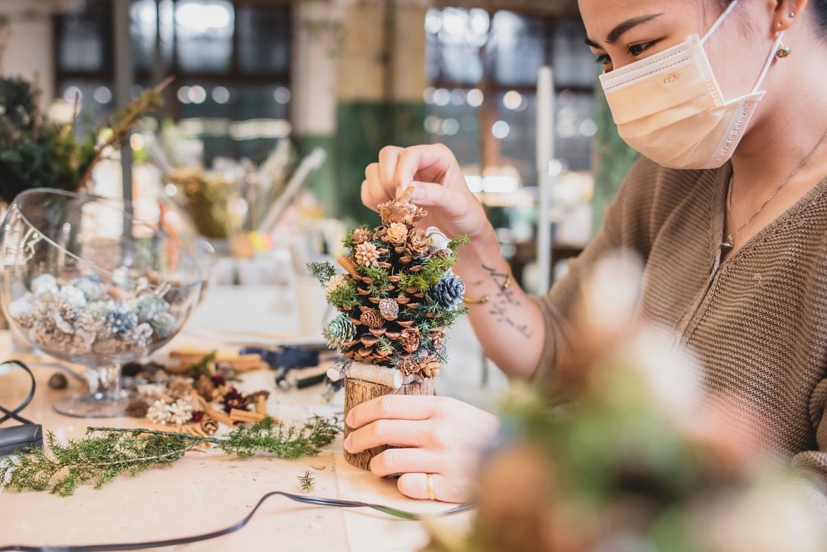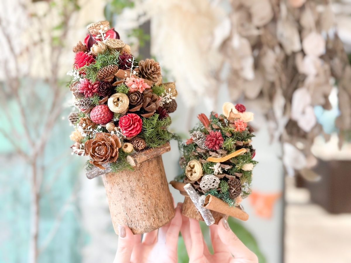 聖誕節期間最熱門的商品「松果聖誕樹」以天然的松果與木頭為基底,搭配乾燥花或永生花等天然素材手工製作而成。 小巧可愛的松果聖誕樹,可於線上購買,也可報名實體體驗課程親手DIY,親自感受手作而成的感動!