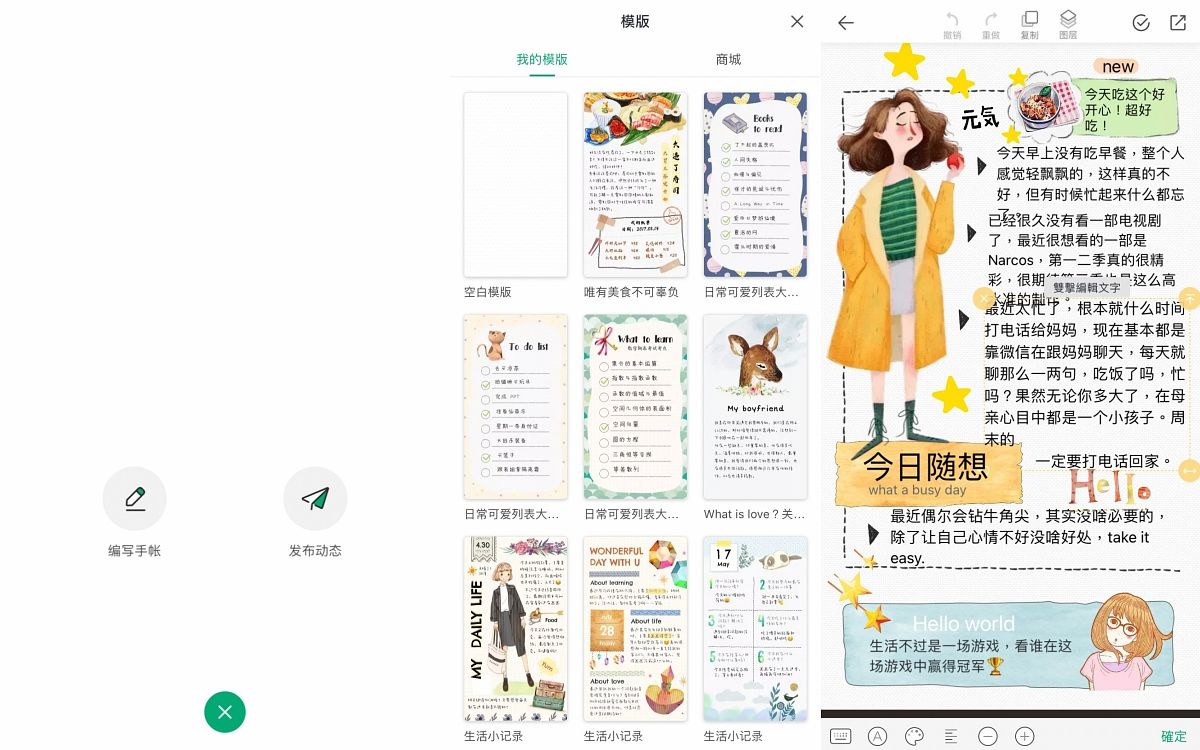 進入編寫手帳後可以看到多種模板,有APP本身內鍵免費的模板可選用去修改,也能選擇空白的模板自己開始設計,另外也有商城能夠購買更豐富、多樣主題的模板,不過其實內建免費的模板就很夠用囉!隨意點選一款後,就能藉由點擊畫面中的各個圖樣元件、文字框來修改或刪除、調整位置等等,基本上操作非常簡單。