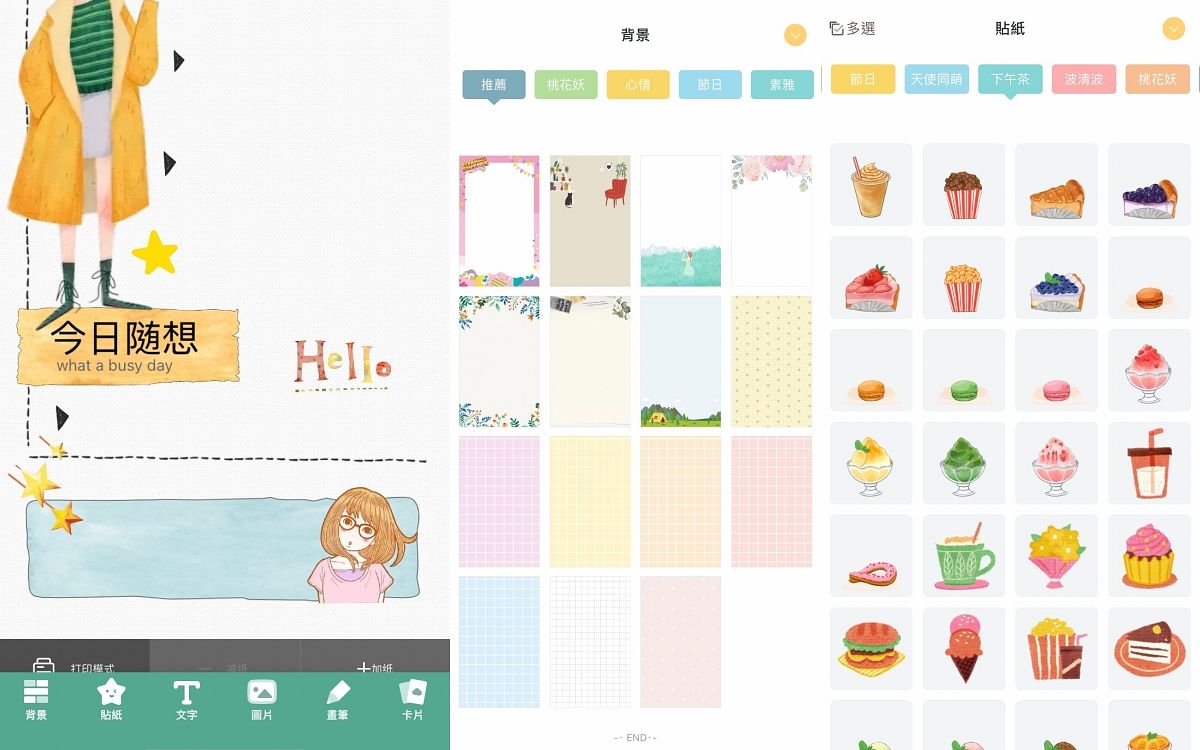 編寫手帳的頁面中除了直接點擊畫面中的元件之外,最下方的功能選單也有多項功能能使用,如「背景」有多種主題的背景顏色、花樣可一鍵套入使用,若選擇空白模板的話,這功能就十分實用囉!另外還有「貼紙」有非常多主題類別、風格樣式的插圖可以選用,就如同實體手帳時我們貼在本本上的貼紙一般。