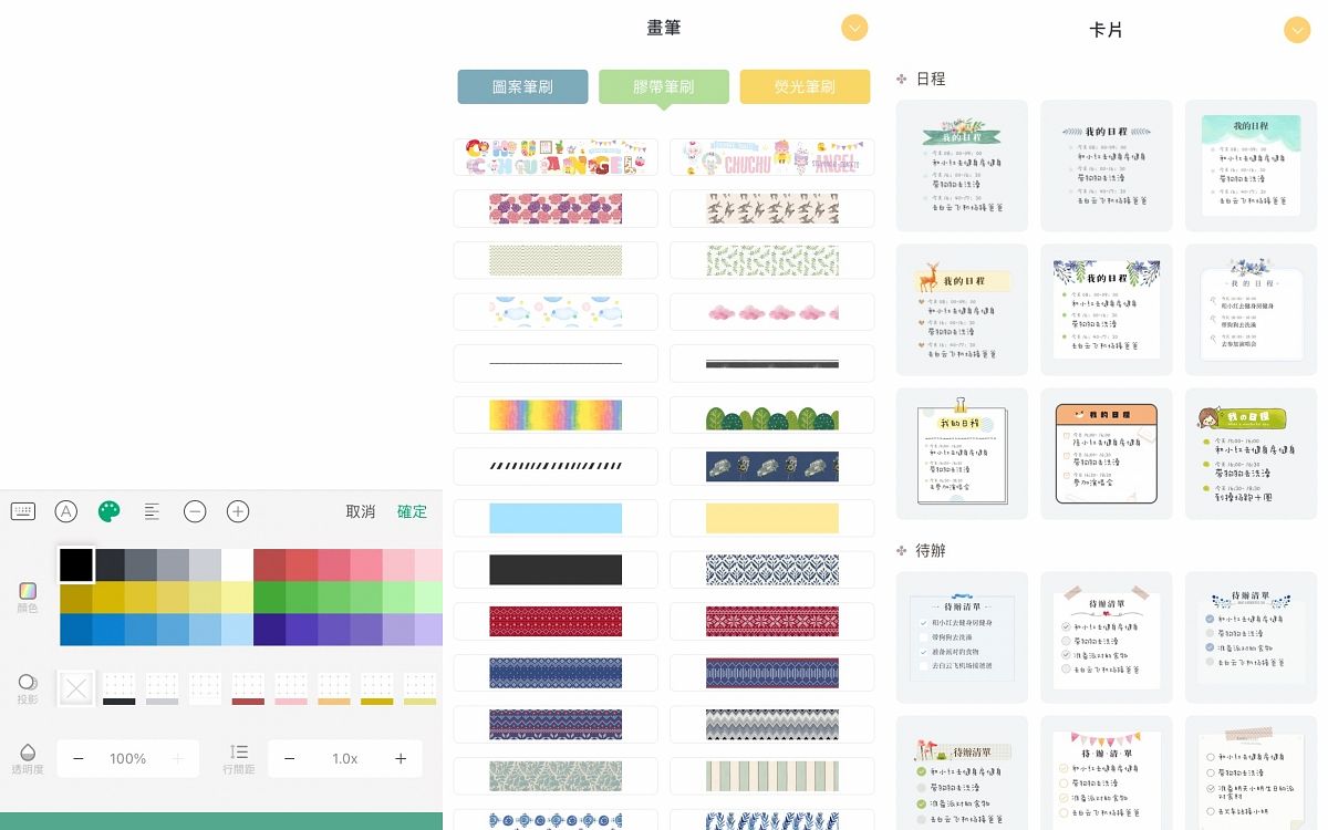 另外手帳當然需要有添加文字的功能,這個APP理不只能調整顏色、大小等,還有多種中英文字型可以選擇,都在文字功能中可以探索,而「畫筆」功能則同等於紙膠帶的效果,選擇之後可以隨意在畫面上使用畫出的大小及角度,最後「卡片」功能則能直接連結手機繪入「行事曆」及「代辦事項」的備忘錄內容喔!