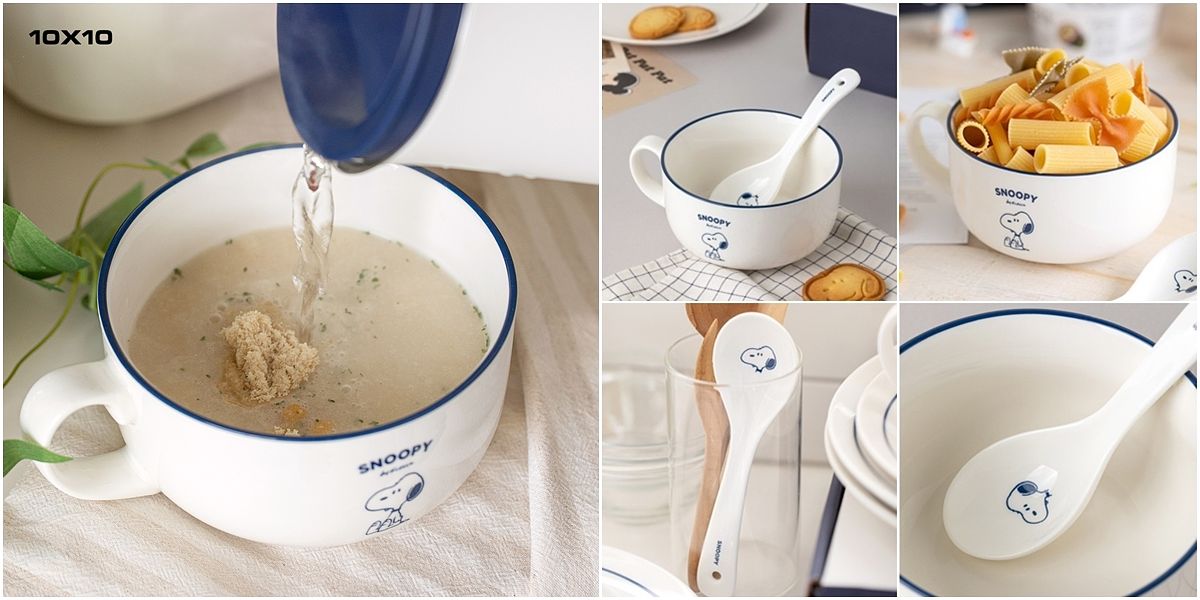 這款Snoopy 餐碗的大小為15 X 7 cm,超適合拿來吃早餐麥片或是泡杯熱湯時使用,陶瓷的材質可放入微波爐與洗碗機,實用性很高;餐碗設計成帶手柄的款式,想拿著移動超方便,不用在另外找托盤來端。 與Snoopy的陶瓷湯匙一起販售,一組的設計、加倍的可愛!