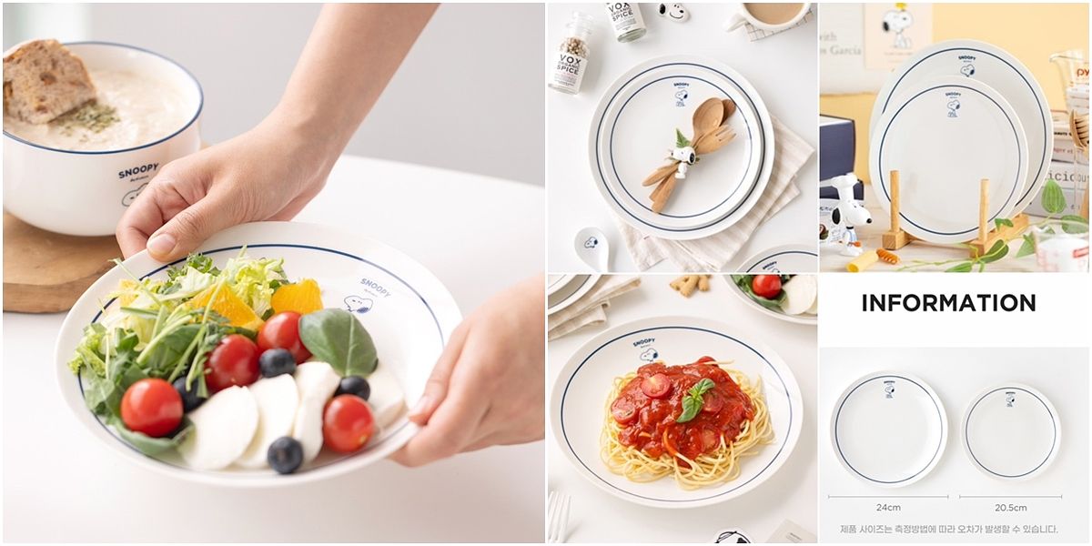 陶瓷餐盤組包含兩種尺寸的餐盤,大的為直徑 24cm、小的直徑 20.5cm,兩種尺寸的出場率都很高,大的可以當作主食盤,小的可以當成甜點盤。簡約的線條,點綴著小圖案就很可愛,邊用餐邊看到Snoopy,餐點都會莫名變得好吃呢~