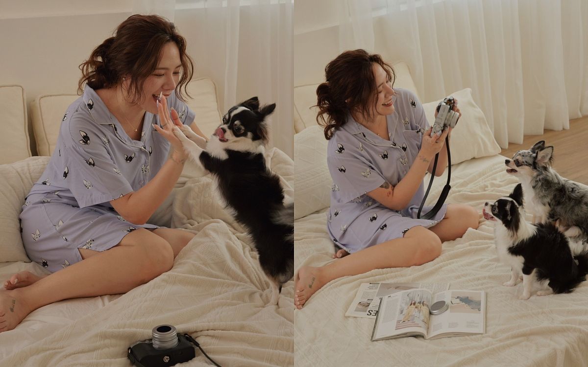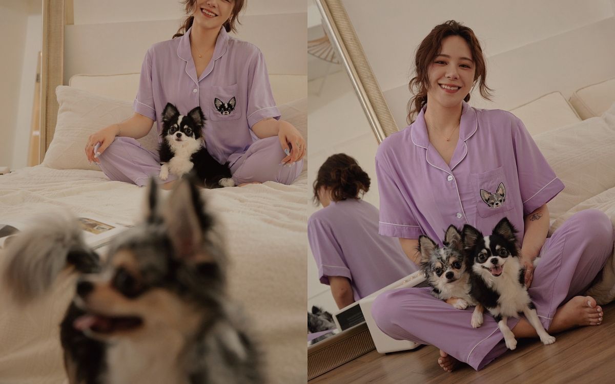 圖片來源:HERE'S TO LOVE除了快閃店限定款外,本次快閃店也有同步販售 HERE'S TO LOVE 與知名部落客-泰拉推出的聯名限量款居家服。以泰拉的兩隻愛犬泰吉、泰利為主軸,共推出兩件式及襯衫洋裝共兩款居家服。寬鬆的剪裁設計提供更大的自由度和舒適感,在面料及顏色的選用上,以純棉材質搭配柔和淡紫色系的搭配,帶給人們輕鬆愉悅的視覺感受,同時增添居家服的趣味性。