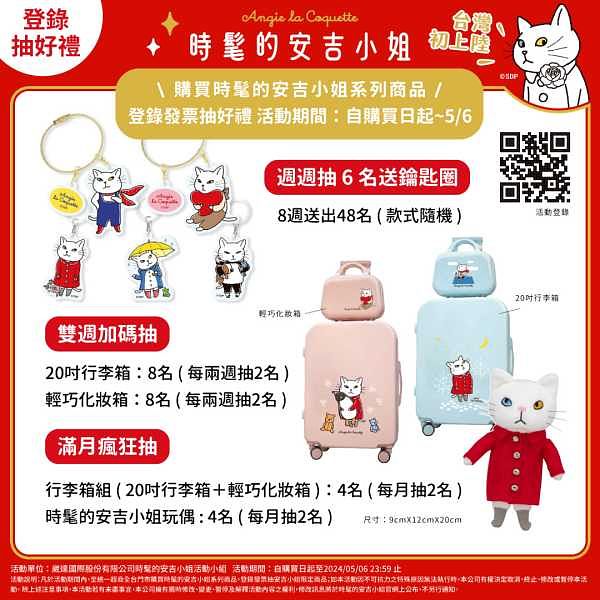圖片來源:7-ELEVEN為歡慶安吉小姐初登場,消費者自3月6日至5月6日止,活動期間購買安吉小姐周邊商品登錄消費發票,就有機會抽中鑰匙圈、20吋行李箱、輕巧化妝箱等限定非賣品好禮。
