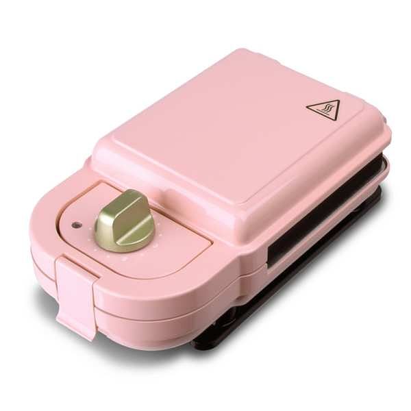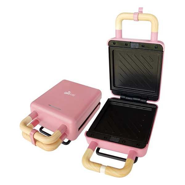 同場加映蜜桃粉色「義大利Giaretti 珈樂堤」熱壓三明治機,附華夫鬆餅、明治兩種烤盤,輕巧便攜,相當適合戶外活動如野餐或露營場合使用。