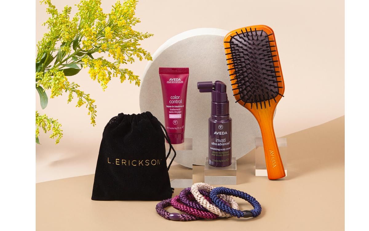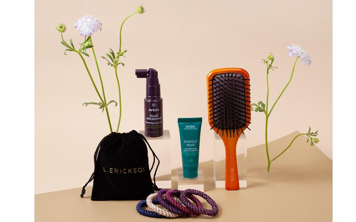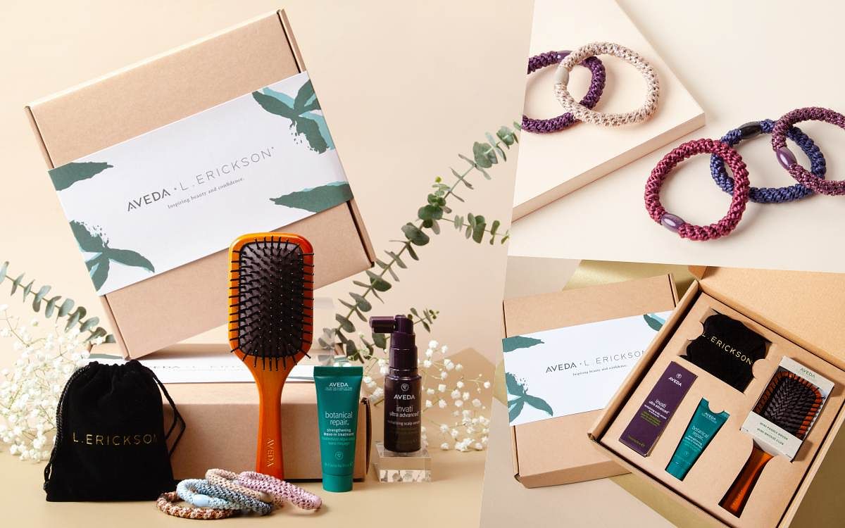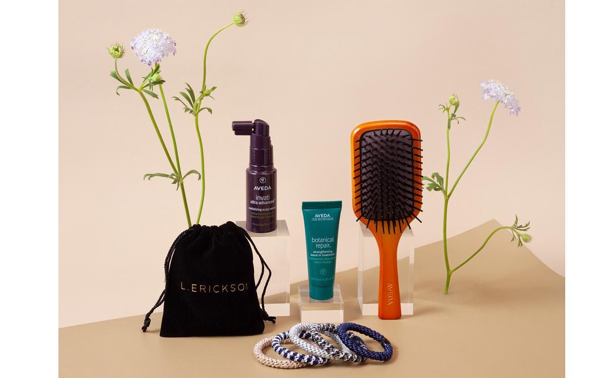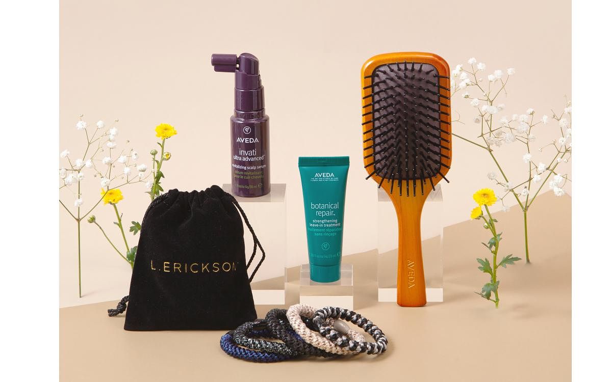 今次推出的L. ERICKSON x AVEDA聯名禮盒包含L. ERICKSON明星商品「粗版彈力髪圈」5入組、AVEDA花植結構重鍵精華、AVEDA蘊活煥欣豐盈菁華以及AVEDA隨行按摩梳,祭出NT$1,800的超值優惠,不到兩千即可入手兼顧純淨高效、時尚風格的髮品組合。