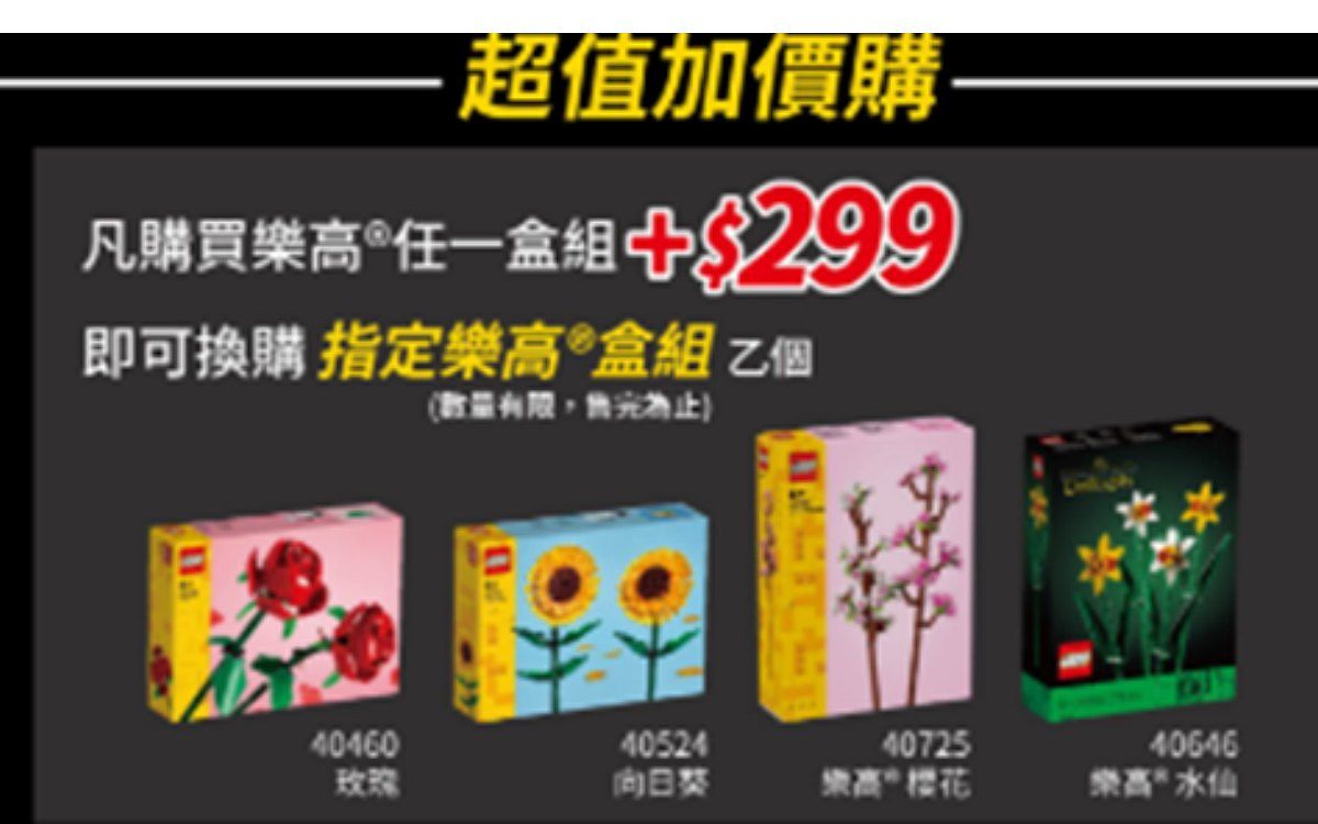 於全台指定通路或「家點樂高®風」居家展間消費任意盒組,並加價$299即可以超值加購價換購指定樂高®盒組乙個。