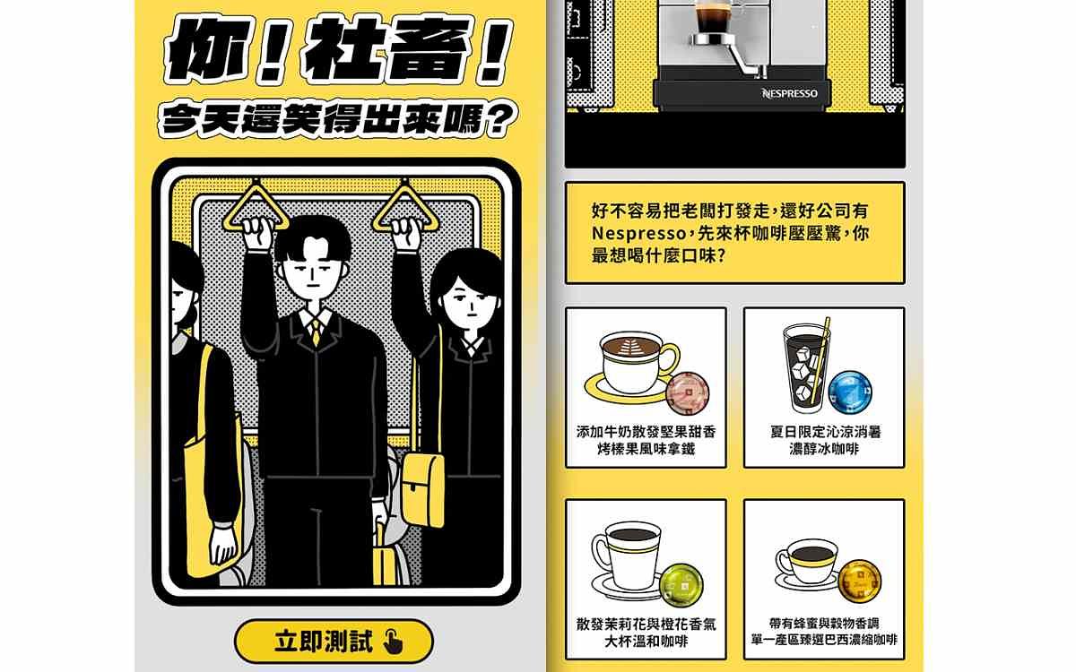 職場險惡,早上先來杯咖啡壓壓驚!身為上班族好夥伴的Nespresso聯手Dcard推出社畜必備「每日運勢測驗」,透過上班族常見的週一症候群、辦公室文化的心理小劇場與日常偏好的咖啡風味等情境題,預測專屬社畜的每日職場運勢。如果你測出來可能是跌到谷底的「小人魔」,特別需要「能閃則閃」來遵守今日職場守則,推薦可以來杯幸運色紅色的義式經典咖啡因減量版咖啡,讓醇厚穀物可可香氣與濃郁口感,幫你擊退厄運;或是平安度過一天的「事業精靈」,推薦你使用幸運色黃色的香草風味咖啡,添加牛奶來製成醇香拿鐵,迷人的甜香氣息幫助你在職場上大膽探索,發展新機會。不管你測出哪種運勢,教你用幽默的職場生存之道應對,再搭配Nespresso推薦的今日好運商用咖啡口味,為辛苦上班的社畜們應援打氣!