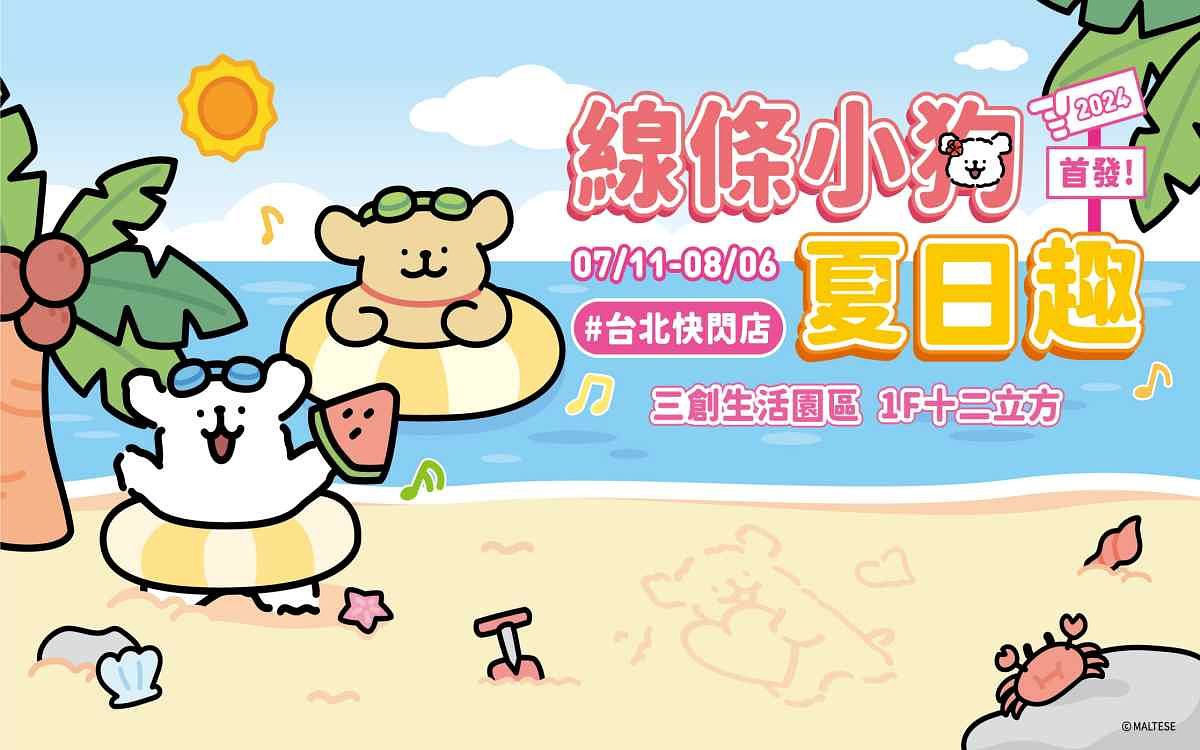圖片來源:品牌提供2022年起在亞洲累積超過百萬粉絲,Maltese線條小狗首次登台,夏日度假感滿滿的小狗旋風席捲而來!首場台北快閃店即日起至8月6日萌夏登場,於台北三創生活園區打造「線條小狗夏日趣」樂園,以夏季不可或缺的陽光、沙灘、海洋元素為視覺,線條小狗們的長出了魚尾巴,在海洋中與海豚、魚群們悠游暢快,彷彿踏入了屬於狗狗們的海底世界;歡慶2024年台北首場快閃店!特别打造1.5公尺高的線條小狗,兩隻小狗一白一金萌力滿滿在入口迎接你!