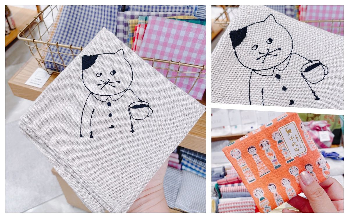 另外右邊的千代布木芥子手帕也是「中川政七商店」的商品,它主要是比一般手帕還小的棉紗手帕,適合放口袋。另一個是作家Shion Sugawara所製作的麻質刺繡包巾,來自「倉敷意匠 sennokoto」。