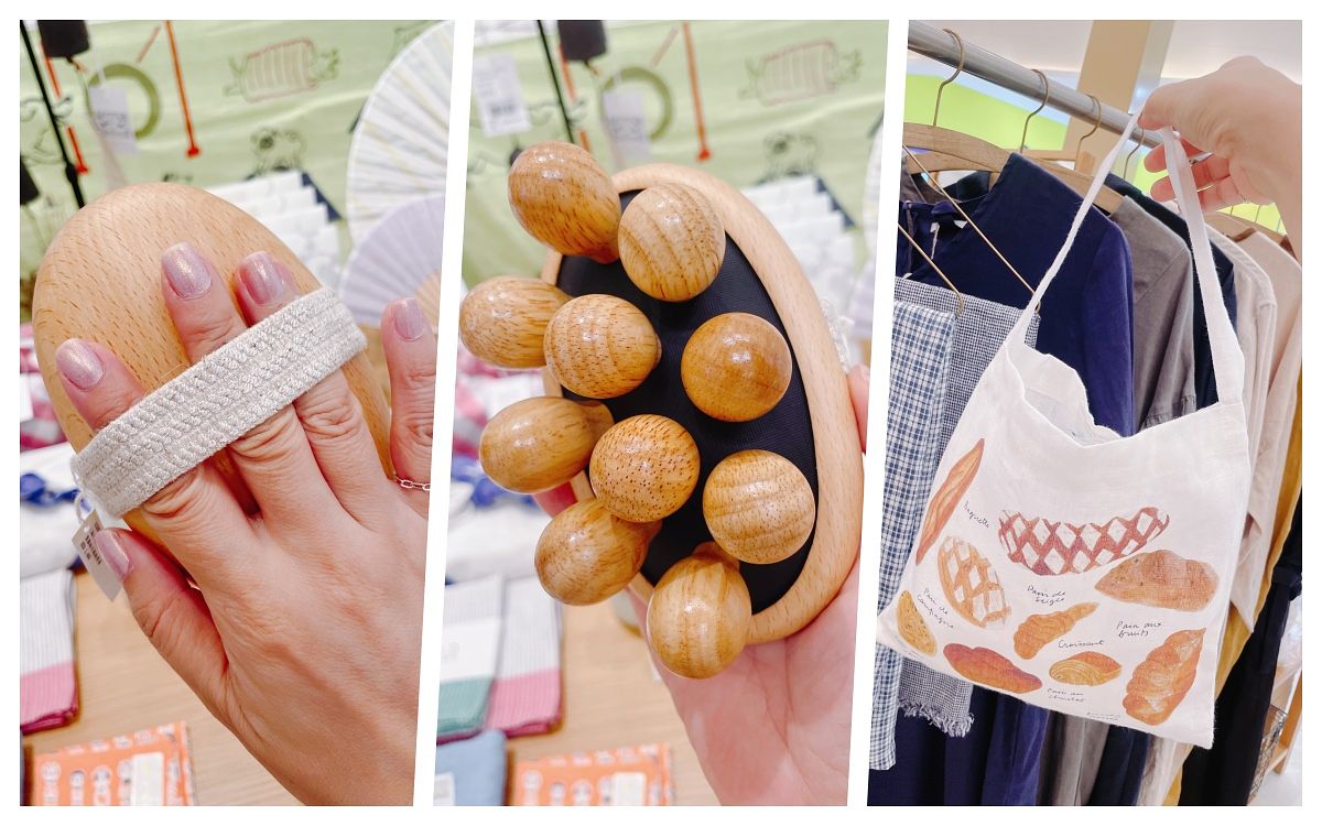 「中川政七商店」還有美容小道具及其他生活用品,「木製圓珠穴道按摩器」用起來超有感,因為圓珠很大顆,另外“鹿家族”布面摺扇還有迷你掌中型尺寸,長度就跟眼鏡差不多,可以放進女生的小廢包中。「fog-ISABELLE BOINOT」的麵包提袋也很可愛。