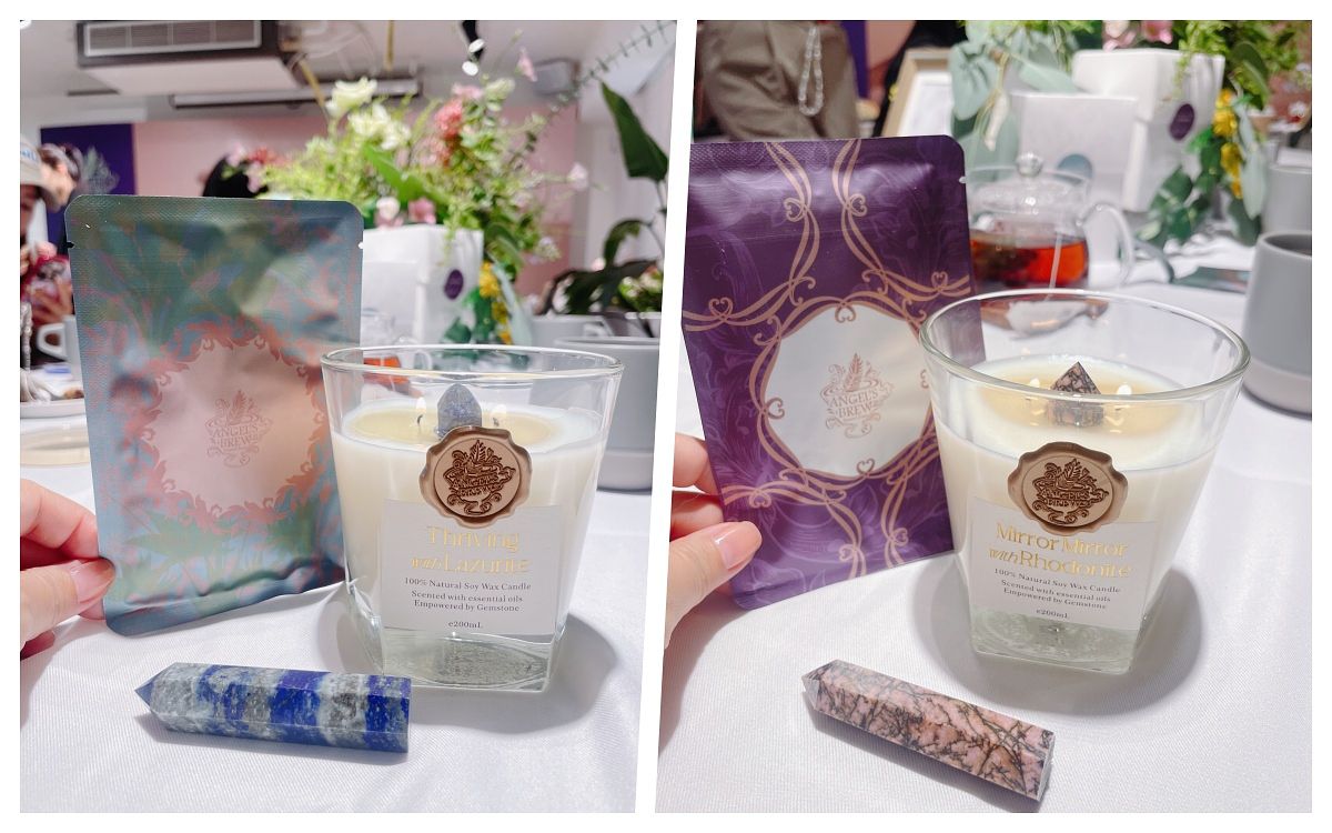 接著、工作人員幫我遞上對應「魔鏡」花草茶的蠟燭─「玫瑰石能量精油蠟燭」,這2款是專為夜晚睡前所設計,但一開始嚇一跳?!蠟燭中間是什麼?居然是真正具有能量的玫瑰石喔!點到一半就可以取出!