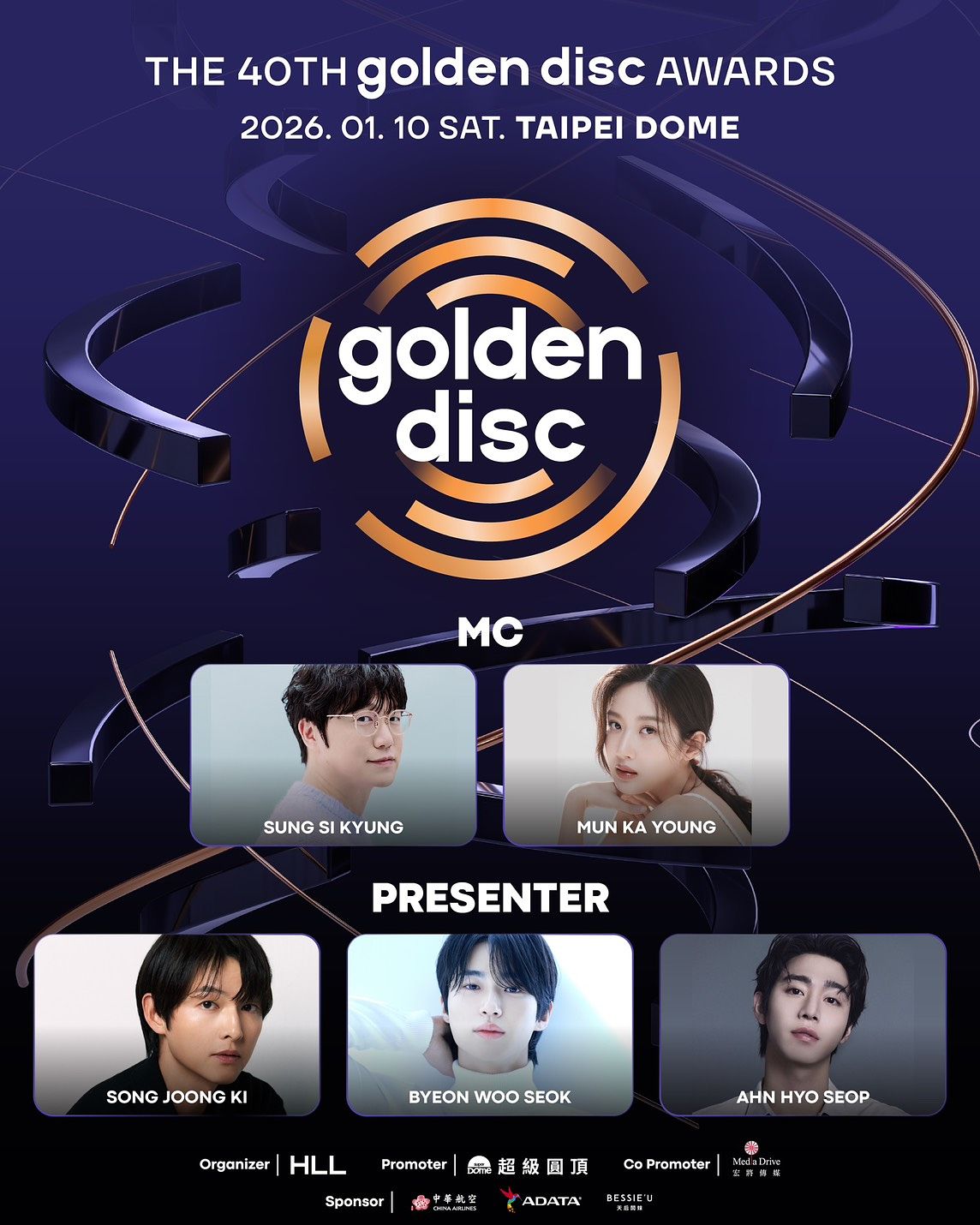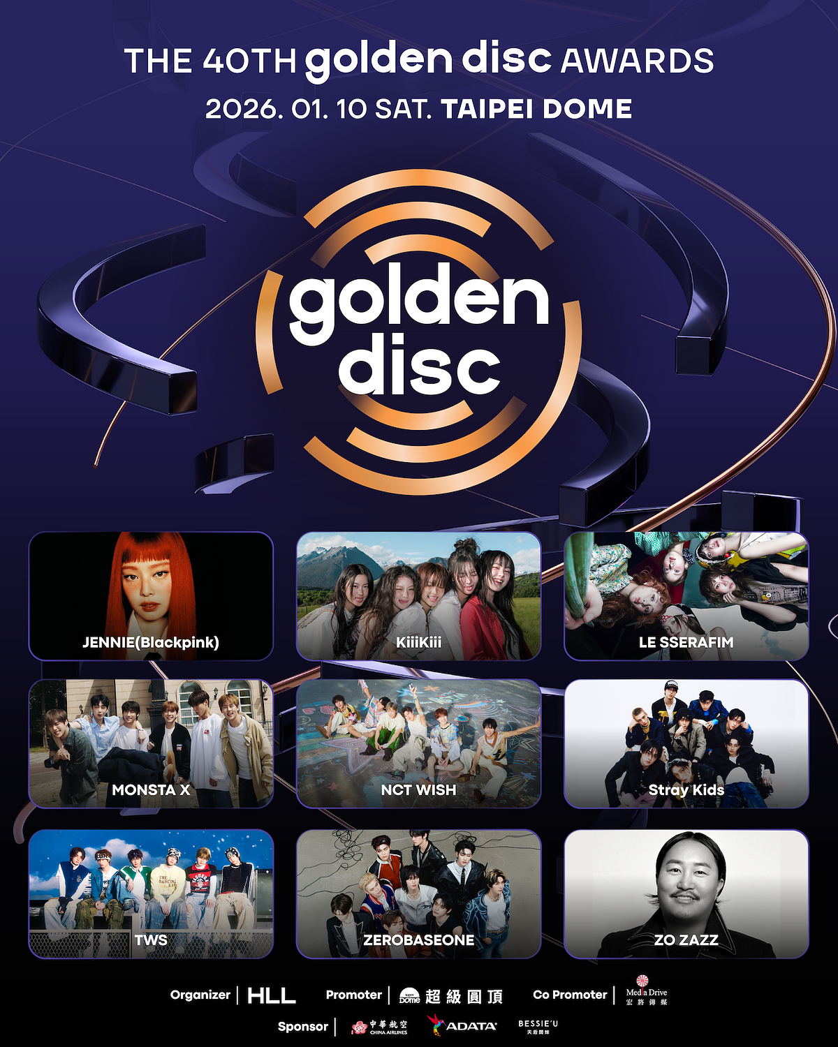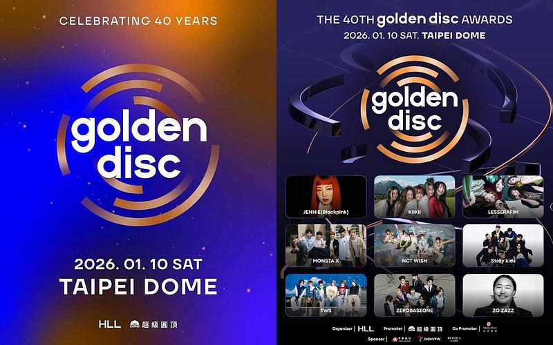 為迎接四十週年,韓國指標音樂獎項《第 40 屆金唱片頒獎典禮 The 40th Golden Disc Awards》將於 2026 年 1 月 10 日首度移師臺灣舉行,地點選在臺北大巨蛋,主辦單位完整公開 18 組出演卡司,售票日也確定於 12 月 13 日。本次陣容包括 ALLDAY PROJECT、ARrC、ATEEZ、BOYNEXTDOOR、Close Your Eyes、CORTIS、ENHYPEN、IVE、izna、BLACKPINK成員JENNIE、KiiiKiii、LE SSERAFIM、MONSTA X、NCT WISH、Stray Kids、TWS、ZEROBASEONE、ZOZAZZ 等 18 組年度精彩陣容。