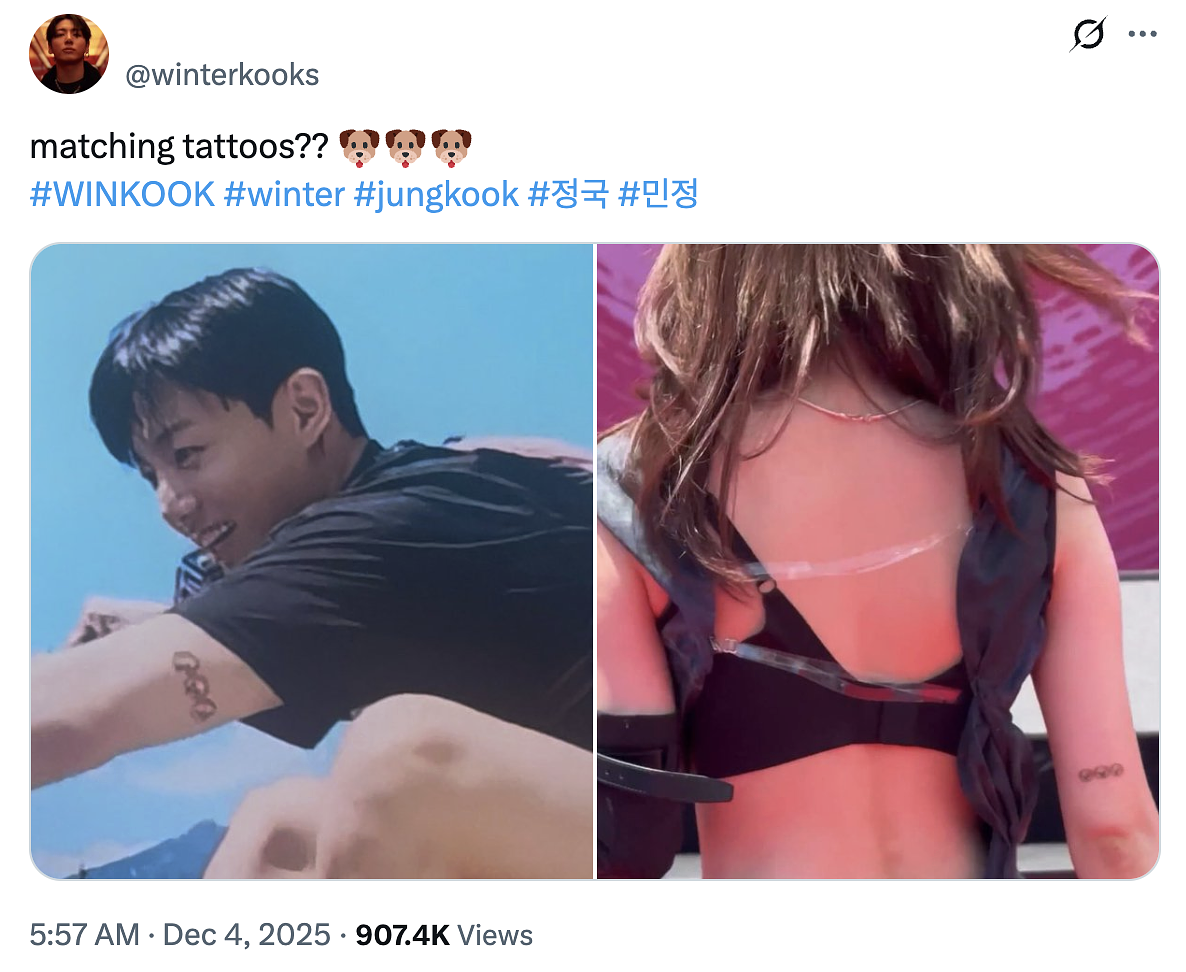 兩人最新被熱議的就是位於手肘上方的同款刺青,不僅刺在相同位置,就連圖案都是三隻狗狗的樣子,據悉,Jung Kook 在退伍時的照片就有被拍下該刺青,表示可能是於當兵期間去刺的。而有 aespa 粉絲透露,有人曾在直播時問起 Winter 該刺青,但當時 Winter 並未多做回應。不過對於同款刺青,韓國網友們大多更驚訝於,若兩人真的是交往關係的話,真的有辦法去刺情侶刺青嗎?有人表示「現在 MZ 世代想法真不一樣」、「萬一之後分手了該怎麼辦呀?」