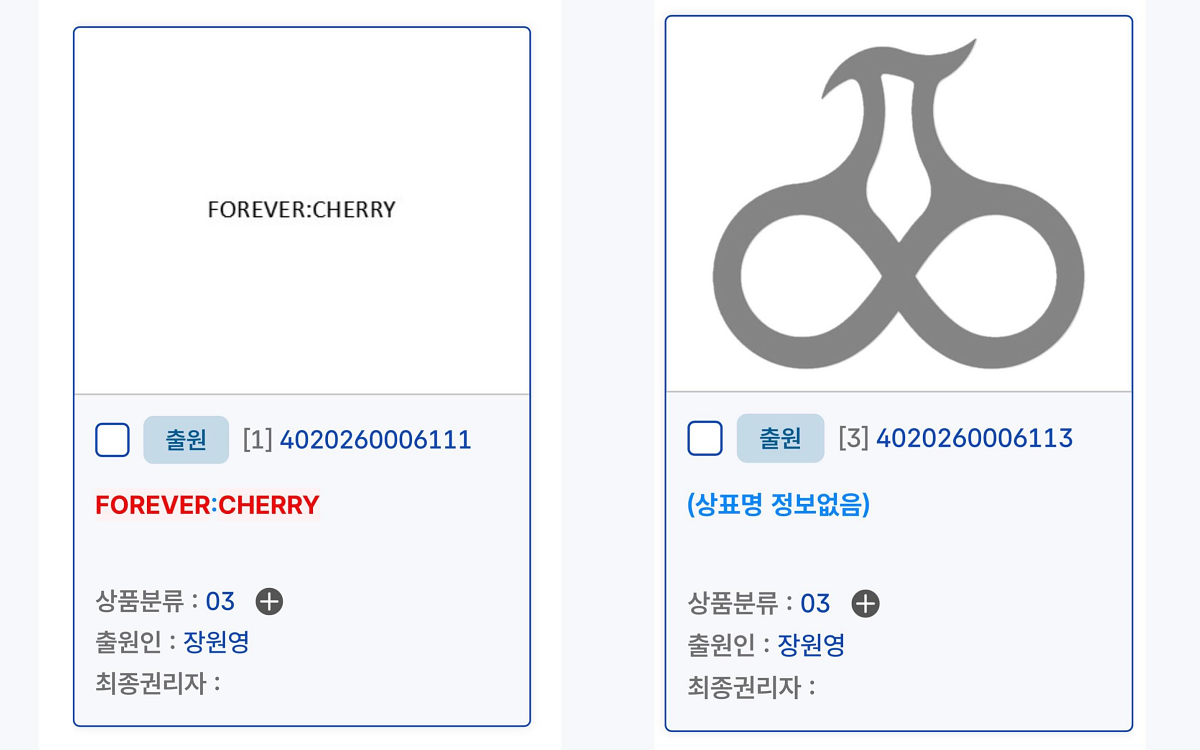 公開全新 IG 帳號後,近日有人發現在 KIPRIS(韓國專利資訊檢索系統)上,張員瑛以個人名義註冊了「FOREVER:CHERRY」、「포에버:체리」 以及櫻桃造型 LOGO 的商標權。而註冊的商品類別則涵蓋了化妝品、精油、電動牙刷等,總計多達 30 個項目。這讓大眾與粉絲們確信張員瑛即將推出個人品牌,開拓事業版圖,然而真相卻並非如此!