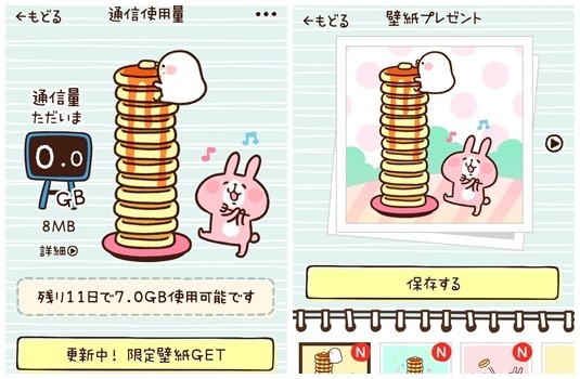 按下兔兔及P助下方的「往右箭頭」,就來到通信使用量的顯示主頁面,可以看到目前使用的用量、剩下的用量為多少,而且依造目前所使用掉的流量,鬆餅就會逐量的被兔兔跟P助嗑光喔~超可愛的!而且還有限定的桌布、小故事,絕對不能錯過啊~~