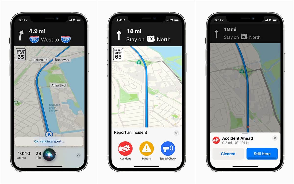 美國和中國的「地圖」使用者現在可以安全且簡單地透過 iPhone或CarPlay上的Siri,回報路徑中的事故、危險或測速事件。在導航時,使用者可以告訴 Siri「前方有車禍」或者「有東西在路上」,甚至回報顯示在地圖上的事故已排除。這項功能設計能讓駕駛無須動用雙手,專注於路況。事故可由乘客透過「地圖」裡的「回報事件」回報或排除。除此之外,「地圖」使用者現在也能在走路或騎腳踏車時,與親友分享預計抵達時間。CarPlay 使用者可以透過新的 Siri 或鍵盤控制使用「分享預計抵達時間」功能。