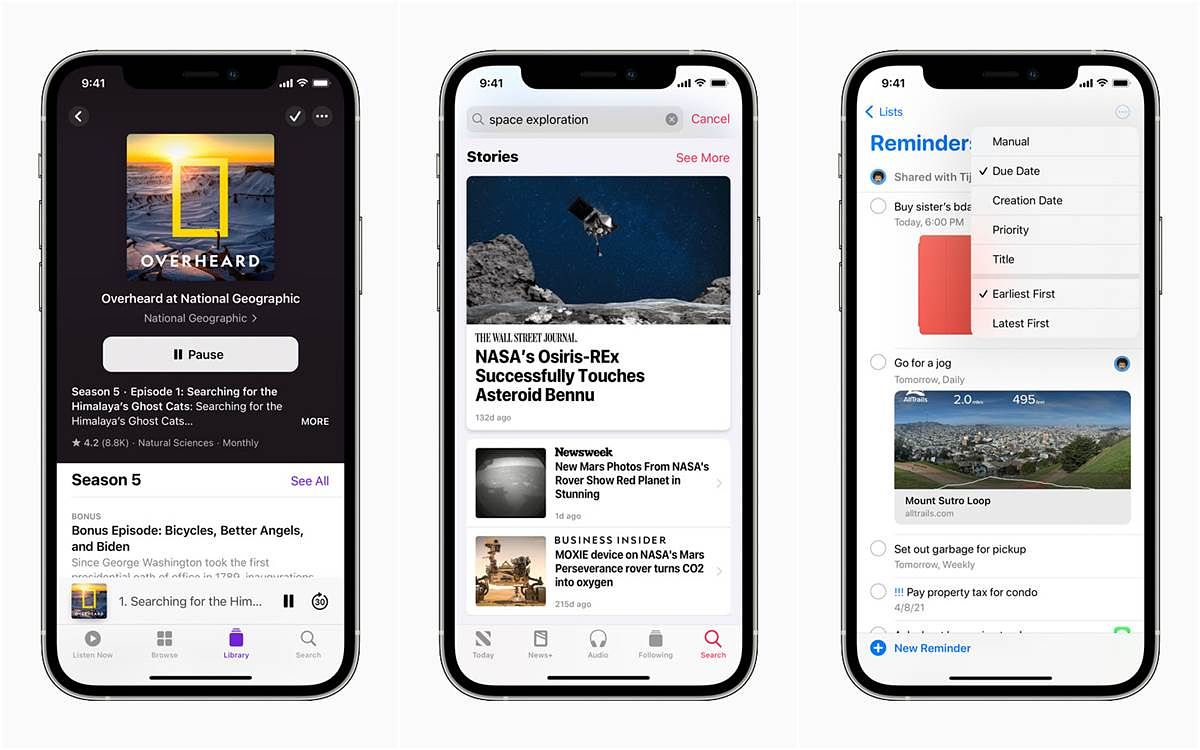 • Apple Podcasts 節目頁面經過重新設計,讓開始聆聽變得更簡單。此外還新增了集數儲存與下載選項,它們將被自動存入「資料庫」以便快速存取。「搜尋」頁面上的排行榜、分類和精選系列可以幫助聽眾發現新節目。