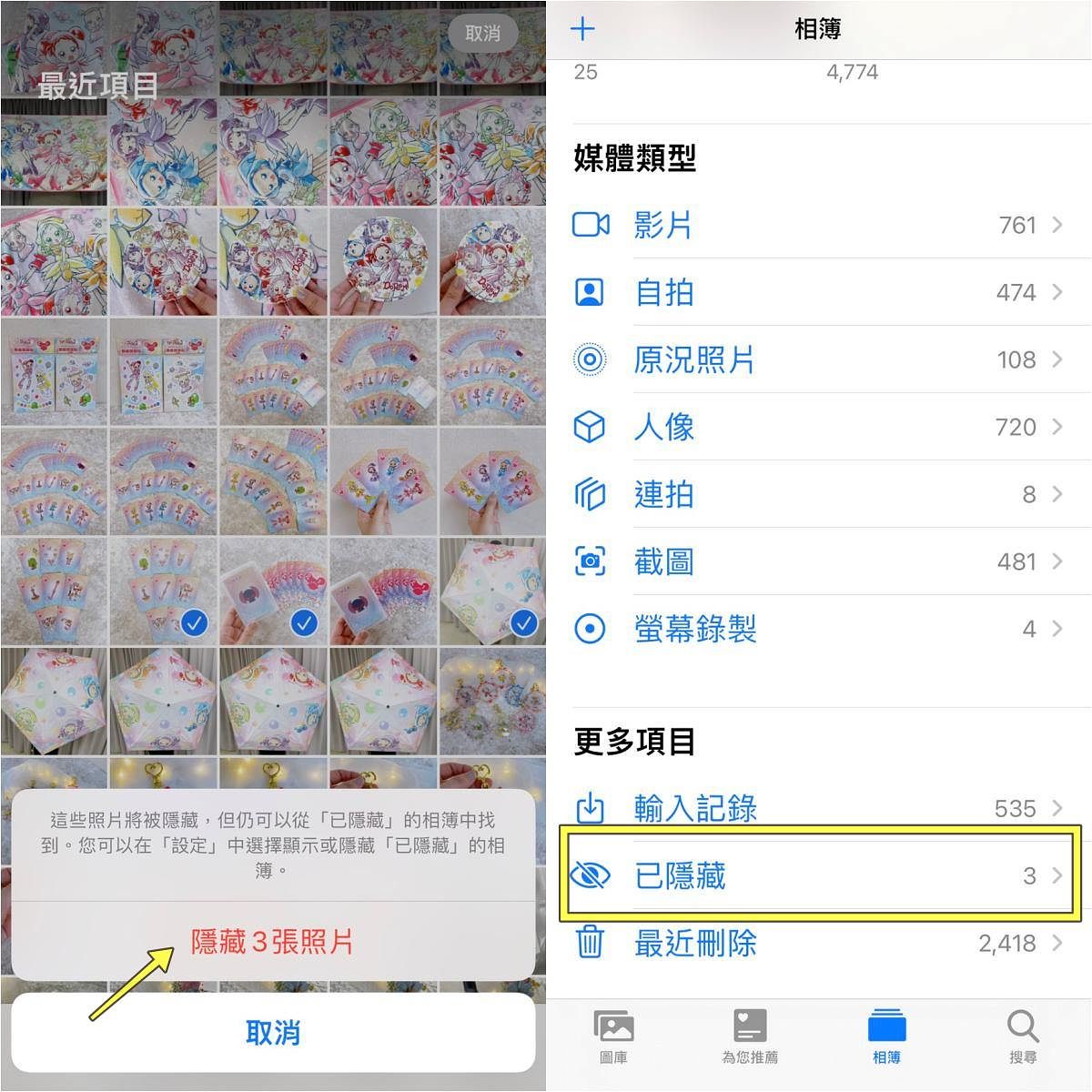 點入隱藏之後,確認隱藏的照片張數,這幾張照片就會被安置在更多項目的「已隱藏」的欄位中,不會出現在一般相簿裡。