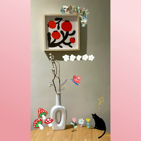 照片中只要有花朵點綴就是可愛!集結了水彩風格、拼貼風格的各種花朵,還有小黑貓與蘑菇,各式討喜的元素,就算通通放進去也是好看。