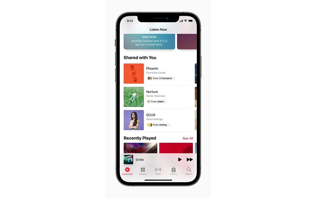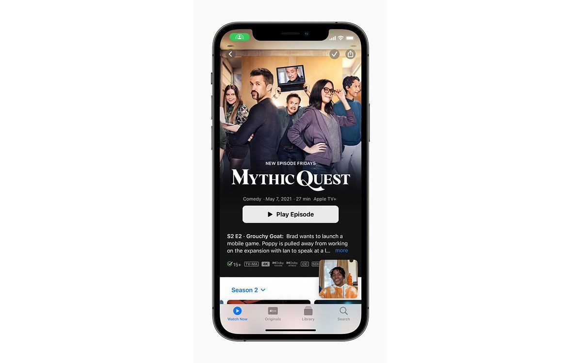 使用者在與朋友進行 FaceTime 通話時,可以用 SharePlay 分享體驗,包括在 Apple Music 上一起聽音樂、同時觀賞電視節目或電影、或分享螢幕一起查看 app。SharePlay 在 iPhone、iPad、Mac 都可使用,而且透過共享播放控制功能,參與 SharePlay 的每個人都可以播放、暫停、快轉。SharePlay 還可以延伸到 Apple TV,使用者可以在進行 FaceTime 通話的同時,在大螢幕上觀賞節目或電影,SharePlay 會同步所有人的播放進度。Disney+、ESPN+、HBO Max、Hulu、MasterClass、Paramount+、Pluto TV、TikTok、Twitch 等都將整合 SharePlay 到他們的 app 裡,創造聯繫互動的全新方法。