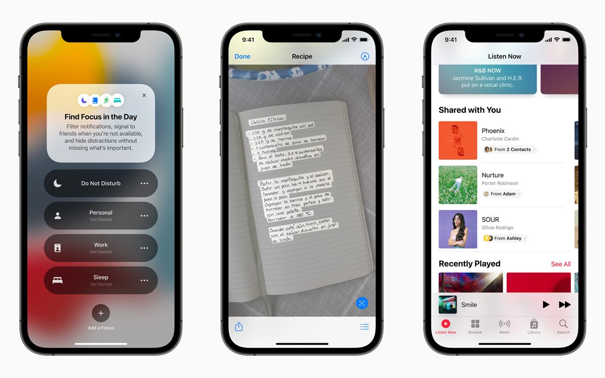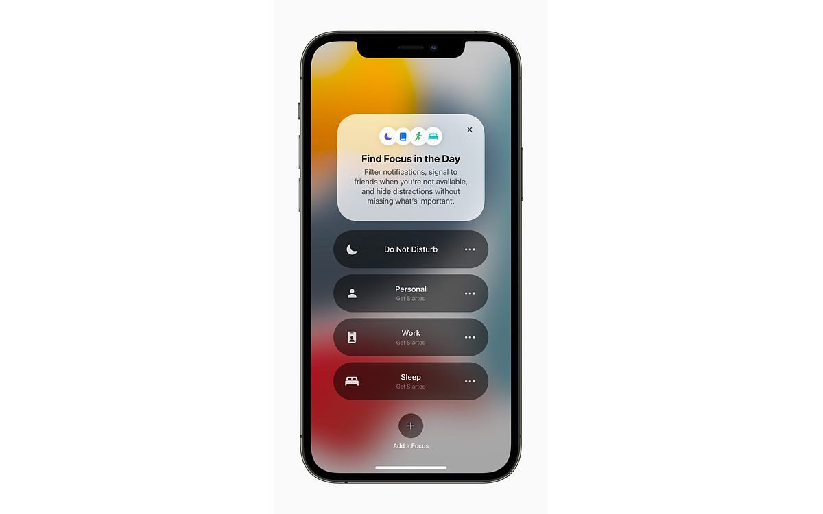 iOS 15 帶來協助使用者專注、減少分心的強大工具。「專注模式」這項新功能會根據使用者想專注的事情,過濾通知和 app。顧客可以透過裝置設定幫助自己專注在當下,自訂「專注模式」或使用建議的「專注模式」,透過裝置端的智慧技術,過濾可以發送通知給使用者的人和 app 。「專注模式」建議是依據使用者當下的情境提供,如工作時段或睡前放鬆。在一個 Apple 裝置上設定好的「專注模式」也會自動套用在其他 Apple 裝置上。使用者可以建立在專注時刻專用的「主畫面」,並自訂需要顯示在畫面中的 app 和小工具,減少干擾。使用者的「專注模式」阻擋訊息接收的同時,「訊息」app 會自動對其他人顯示使用者狀態,表示目前無法聯絡該使用者。