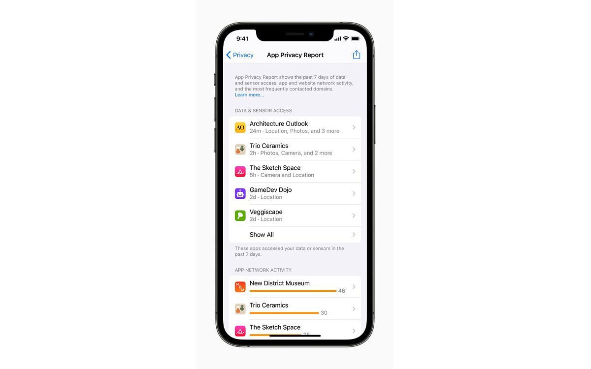 iOS 15 推出更多隱私權控制選項,保護使用者資訊。透過裝置端的語音辨識技術,在預設狀況下,Siri 指令的音訊能在 iPhone 上直接處理,性能大幅提升。「郵件隱私權保護」防止寄件人得知郵件是否被開啟,也隱藏 IP 地址,如此一來寄件人就無法從 IP 地址得知使用者地點,或藉此對使用者進行建檔分析。「App 隱私權報告」概述 app 過去七天內如何使用允許存取的地點、照片、相機、麥克風、和通訊錄,以及與哪些網域有所聯繫。