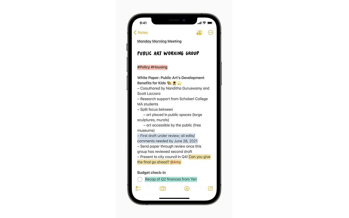 「備忘錄」新增可供使用者自訂的標籤,易於快速分類筆記,「提及」功能讓共享筆記的成員可通知彼此重要的內容更新。全新的 Activity View 可顯示共享筆記的最近編輯紀錄。