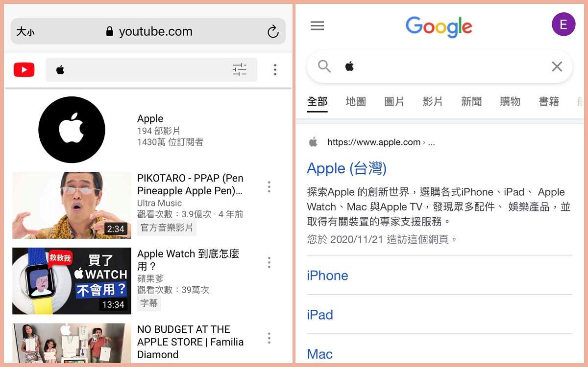 只要在iPhone輸入「蘋果」能打出蘋果LOGO,這件事大家都知道嗎?此外,使用safari或YouTube的時候,用蘋果LOGO 圖示直接搜尋,就能直接搜到蘋果的官網與官方YT頻道喔!