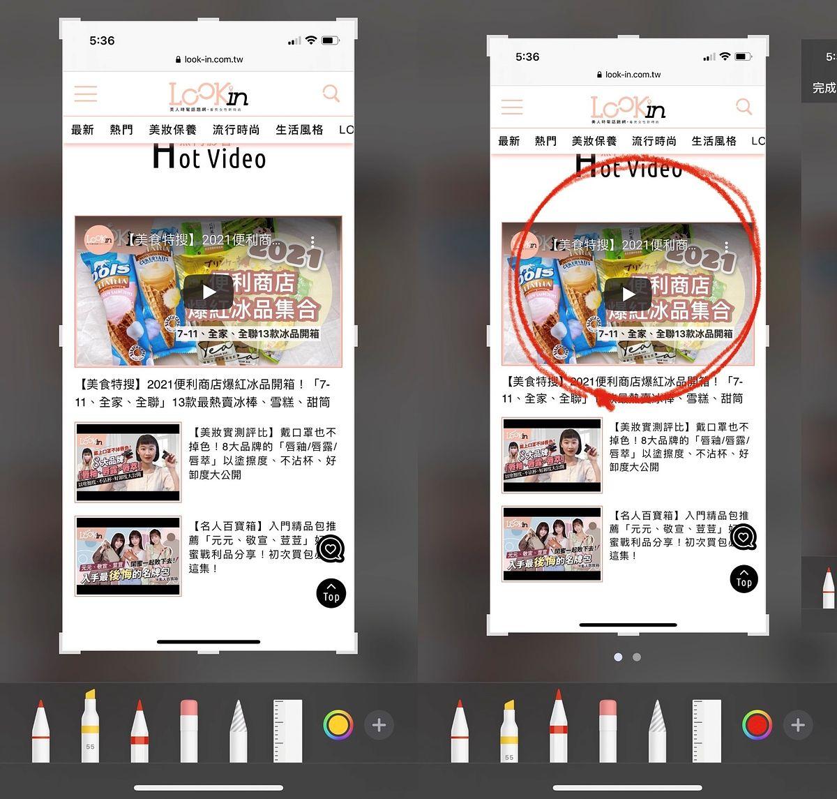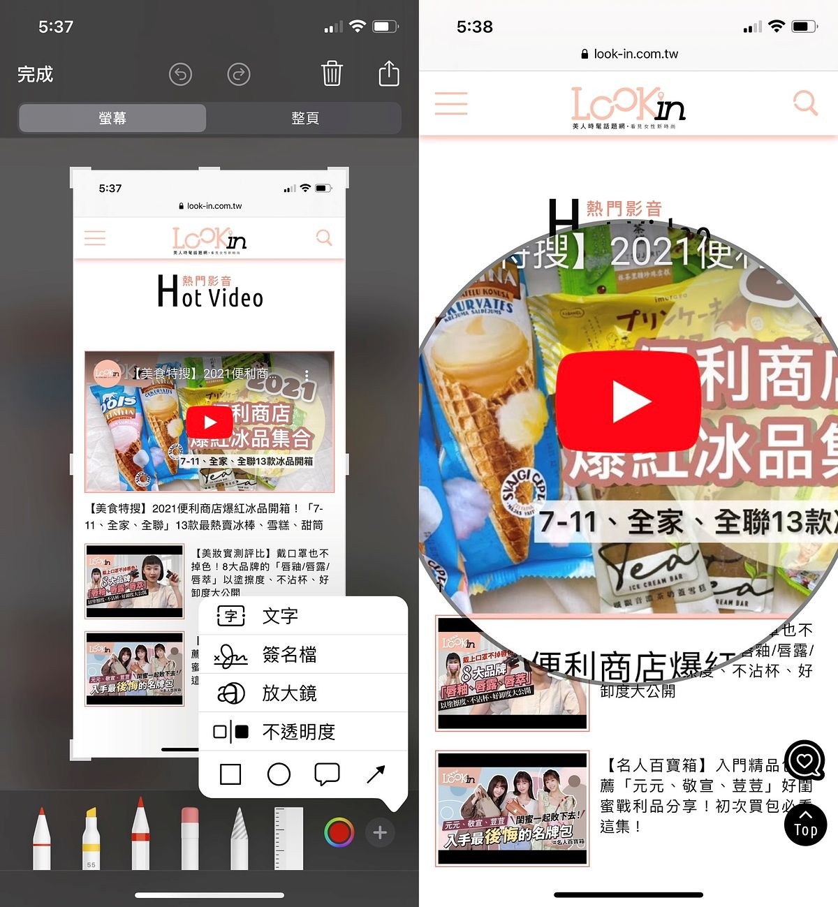 另外,截圖功能裡還有一個放大鏡功能。點選右下的「+」,選擇放大鏡,就能在畫面中將想要強調的部分局部放大,而且呈現的真的是放大鏡的視覺效果,不但實用,也是一種做畫面設計的方式喔!