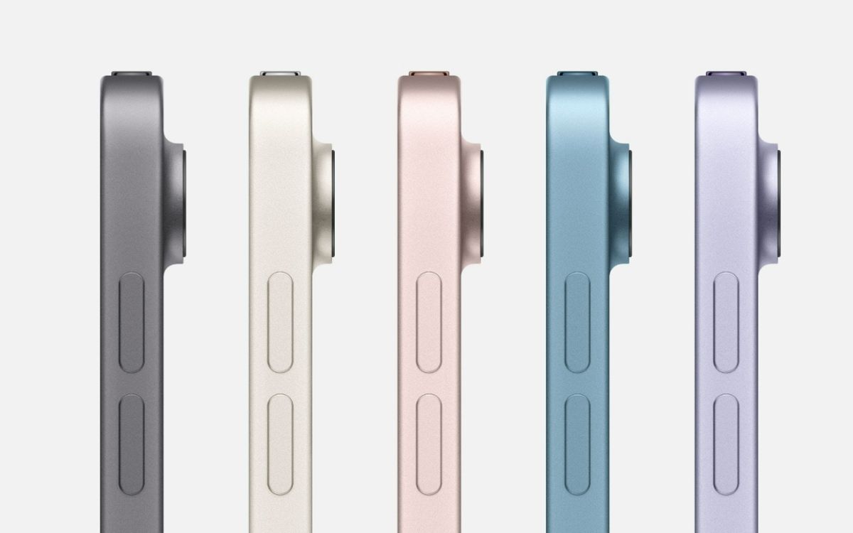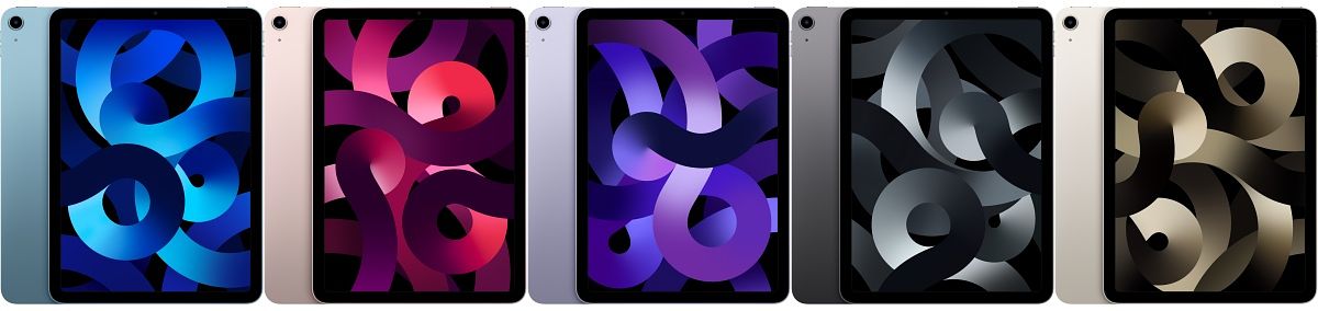 主打輕薄的iPad Air,全新機型提供五種機身色選:太空灰色、星光色、粉紅色、紫色以及全新藍色。搭載10.9吋Liquid Retina顯示器,擁有380萬像素,採用500尼特亮度等。Touch ID置於iPad Air的頂端按鈕,可執行安全認證功能,並解鎖iPad Air、登入App 或使用Apple Pay。