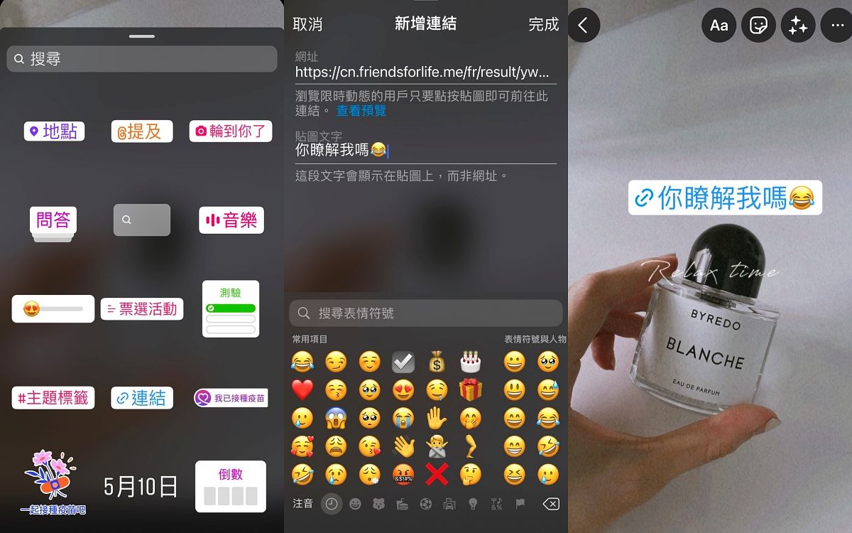 至於設定完之後要如何分享給朋友玩呢?只要先點選平常發佈限時動態的頁面,然後點開更多功能的部分選連結,就能將結果網址設定在網址列,下方的貼圖文字也可以直接設定自己想要的文字,就完成囉!