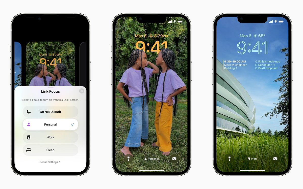 近期最夯的「專注模式」功能能和「鎖定畫面」連結,並且可以為特定的「專注模式」綁定「鎖定畫面」背景圖片和小工具。只要滑到相應的「鎖定畫面」就可開啟該「專注模式」。