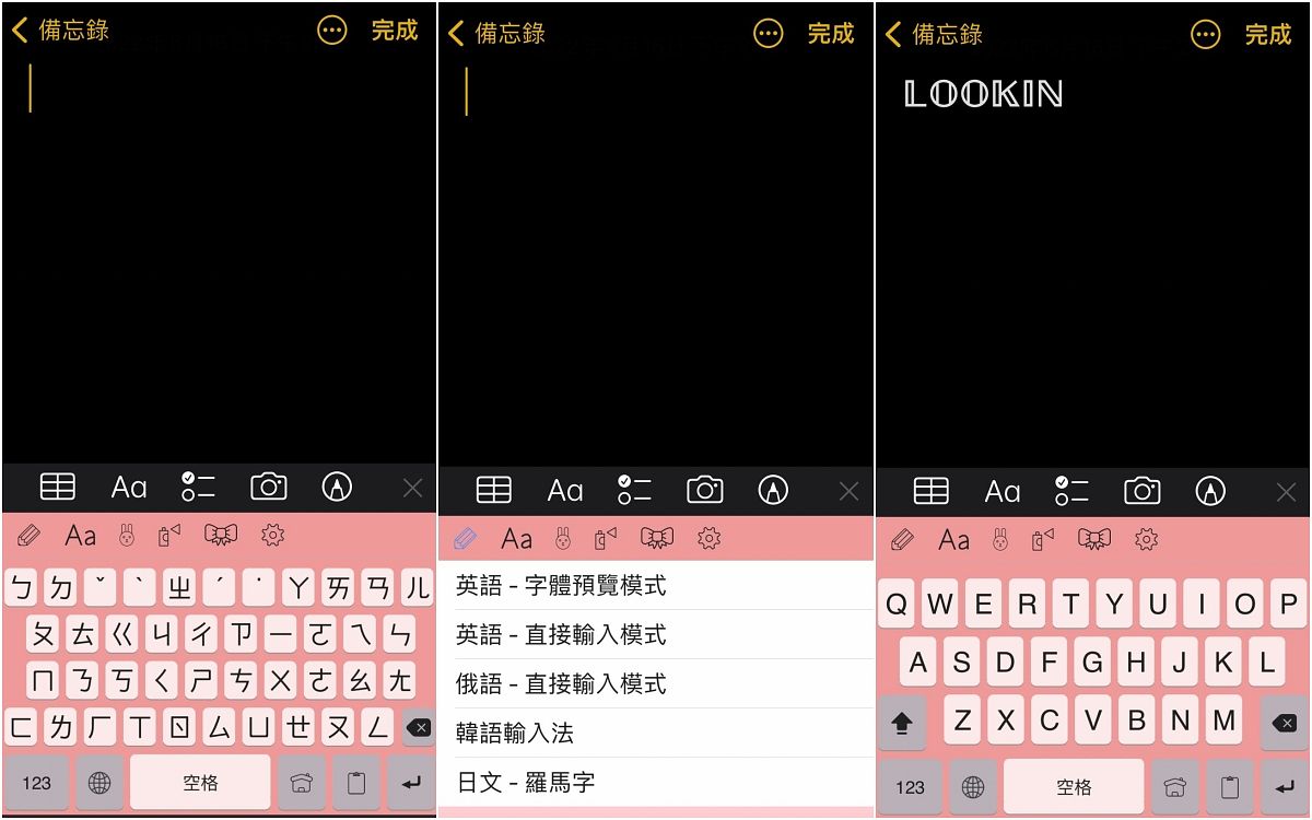 另外點選鉛筆則會出現各種不同的輸入法,點選Aa字母則會出現多款字型可以運用,可愛的設計圖案讓備忘錄賞心悅目。