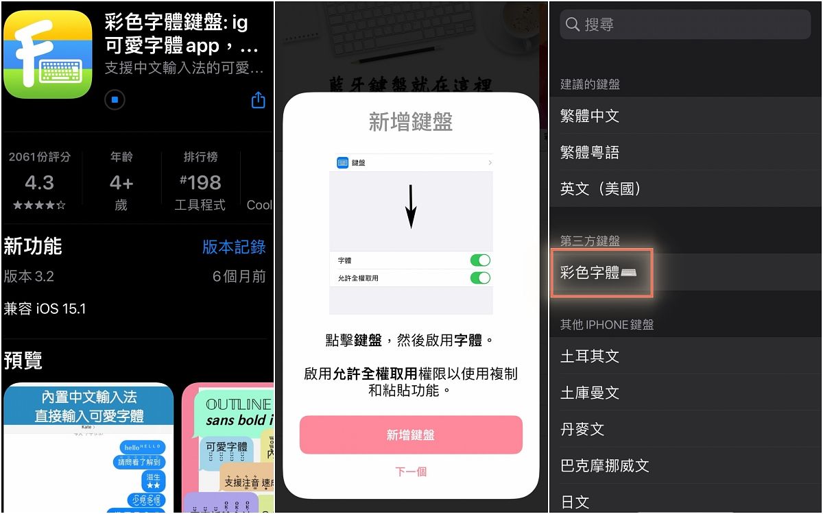 下載完彩色字體鍵盤之後,按照App的指引步驟教學設定手機,點選設定-鍵盤-新增鍵盤就能新增第三方鍵盤「彩色字體」來操作到手機備忘錄之中,色調超級豐富、不怕找不到喜歡的顏色,除此之外也有多款主題可以挑選(有的需要付費才能使用)。