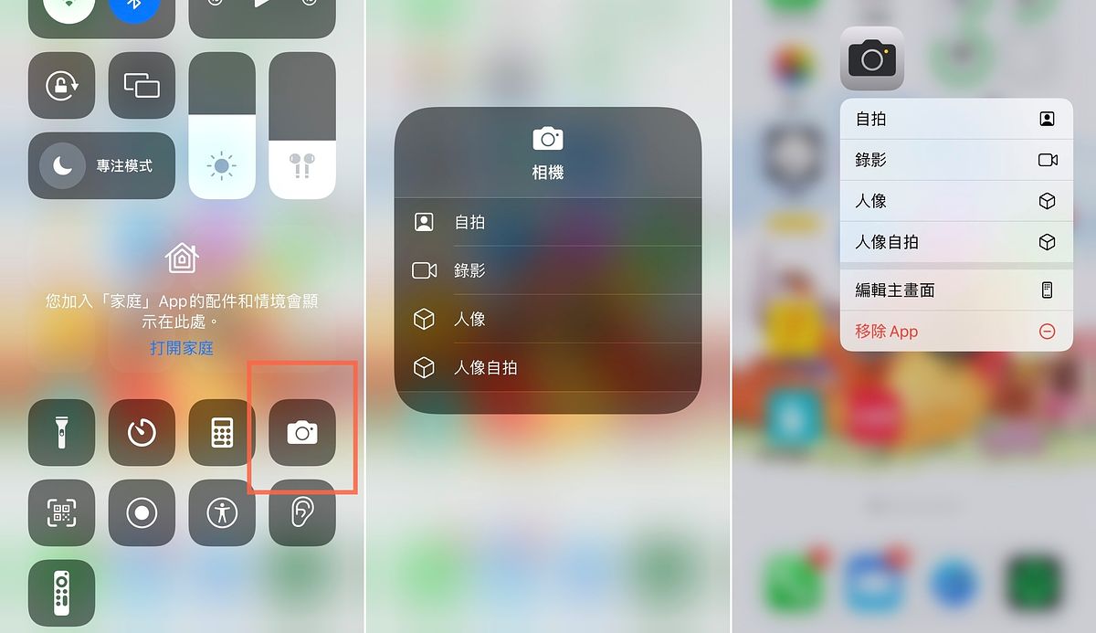 無論是從控制中心、或是介面長按「相機」,就會快速跳出拍照模式,自拍、錄影、人像、人像自拍等,讓妳迅速又精準地拍出想要的照片風格!